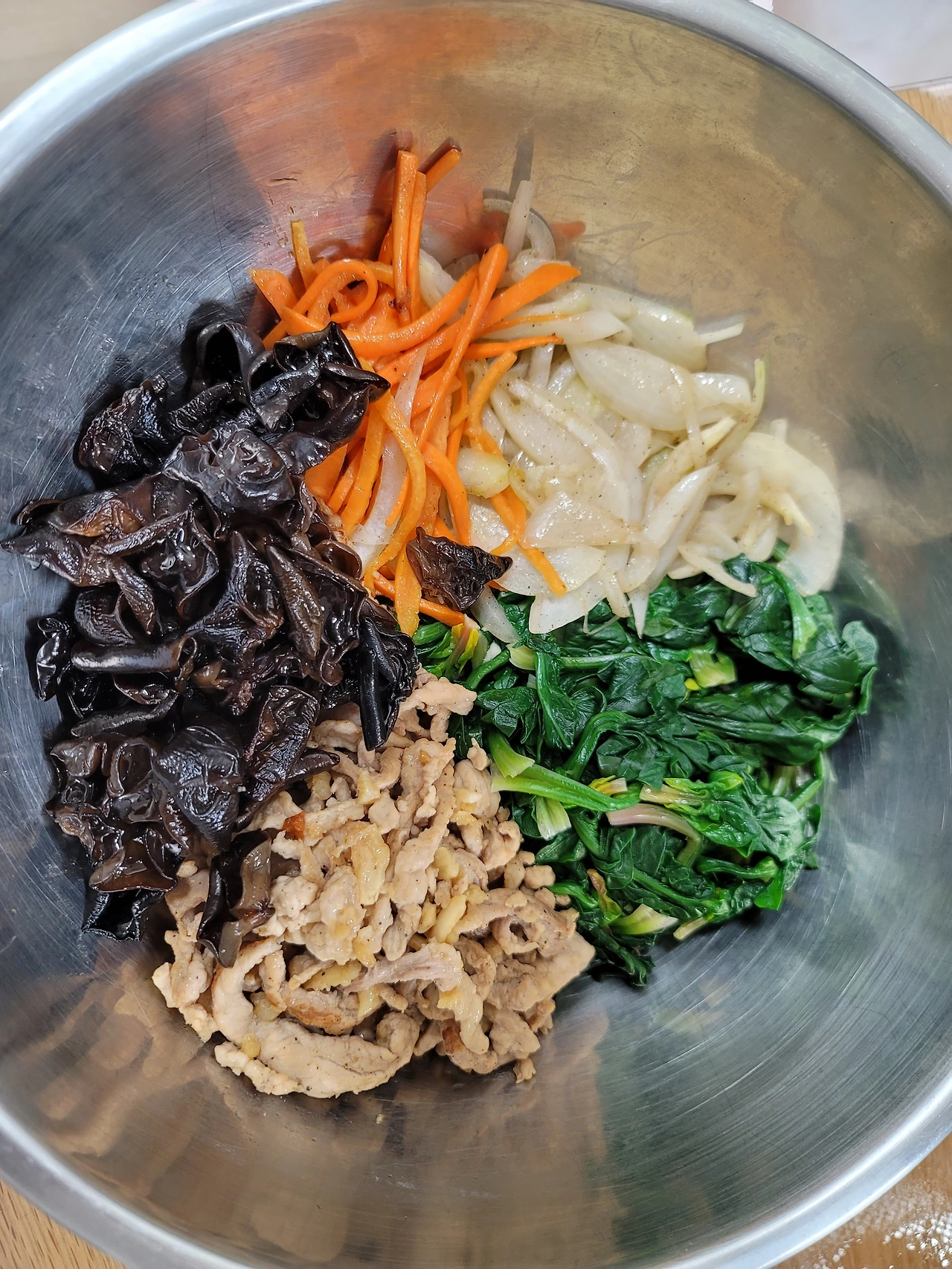야채는 모두 기름에 볶으며 살짝 소금 간을 하고 잠시 식힌다.