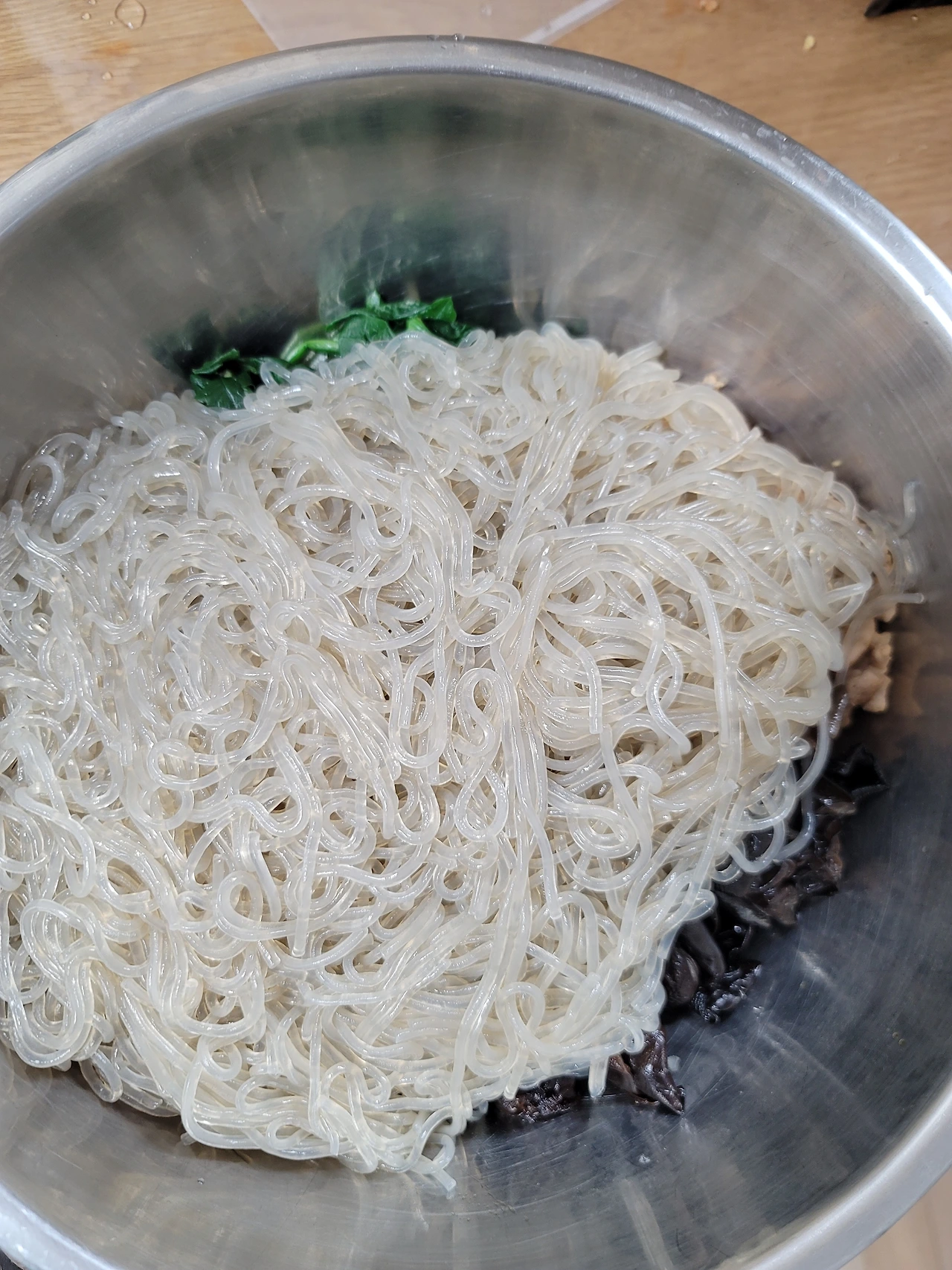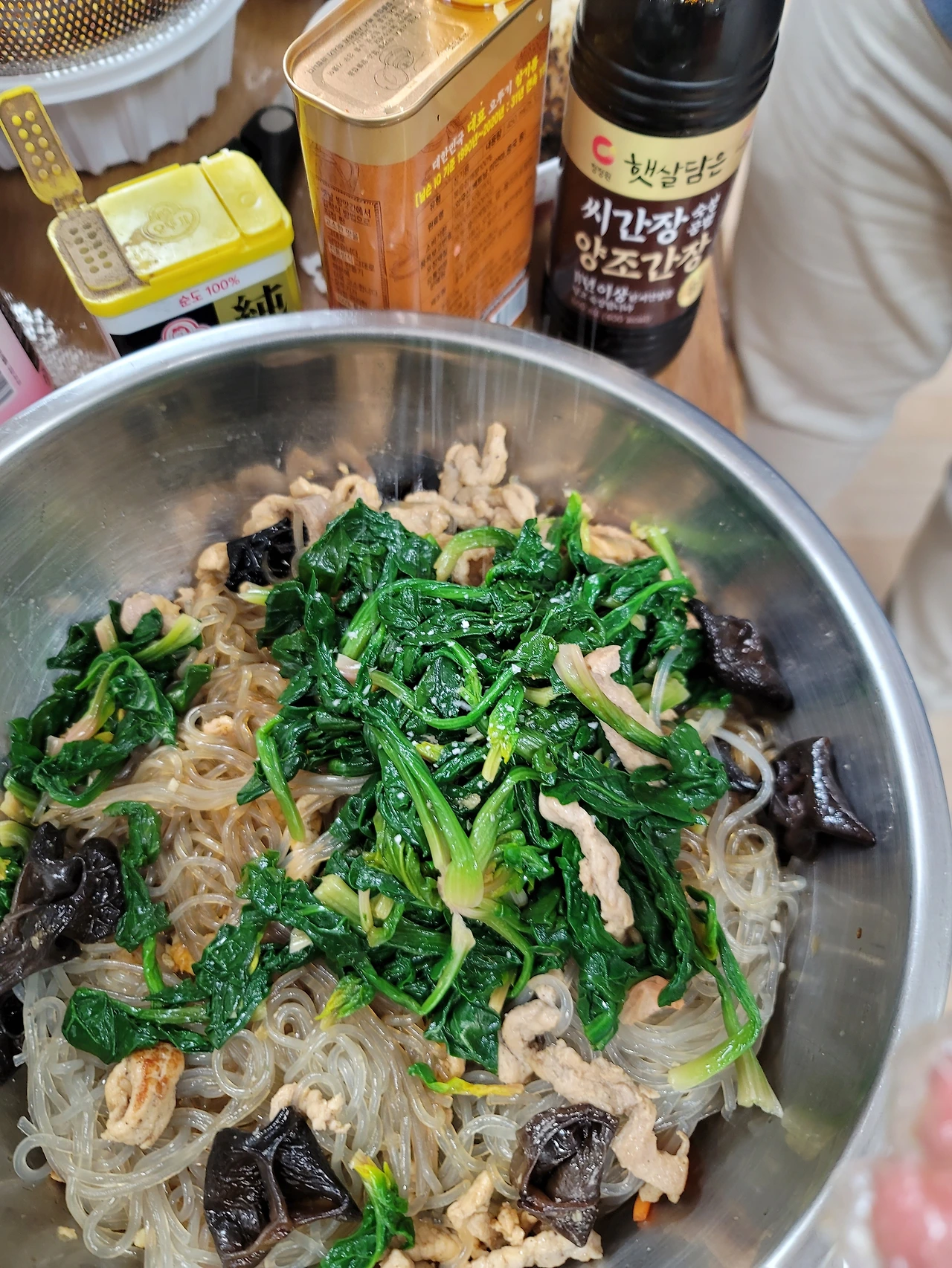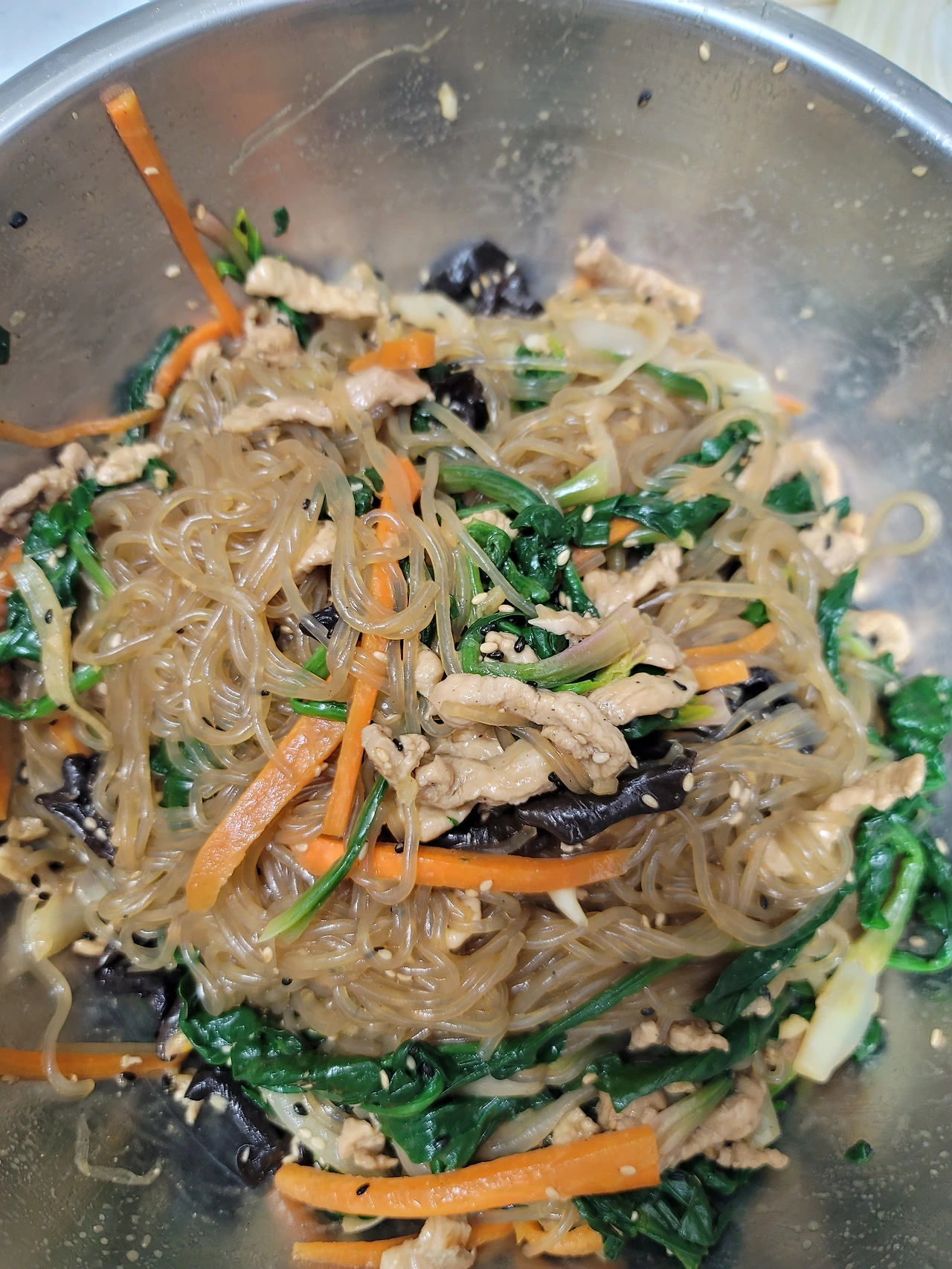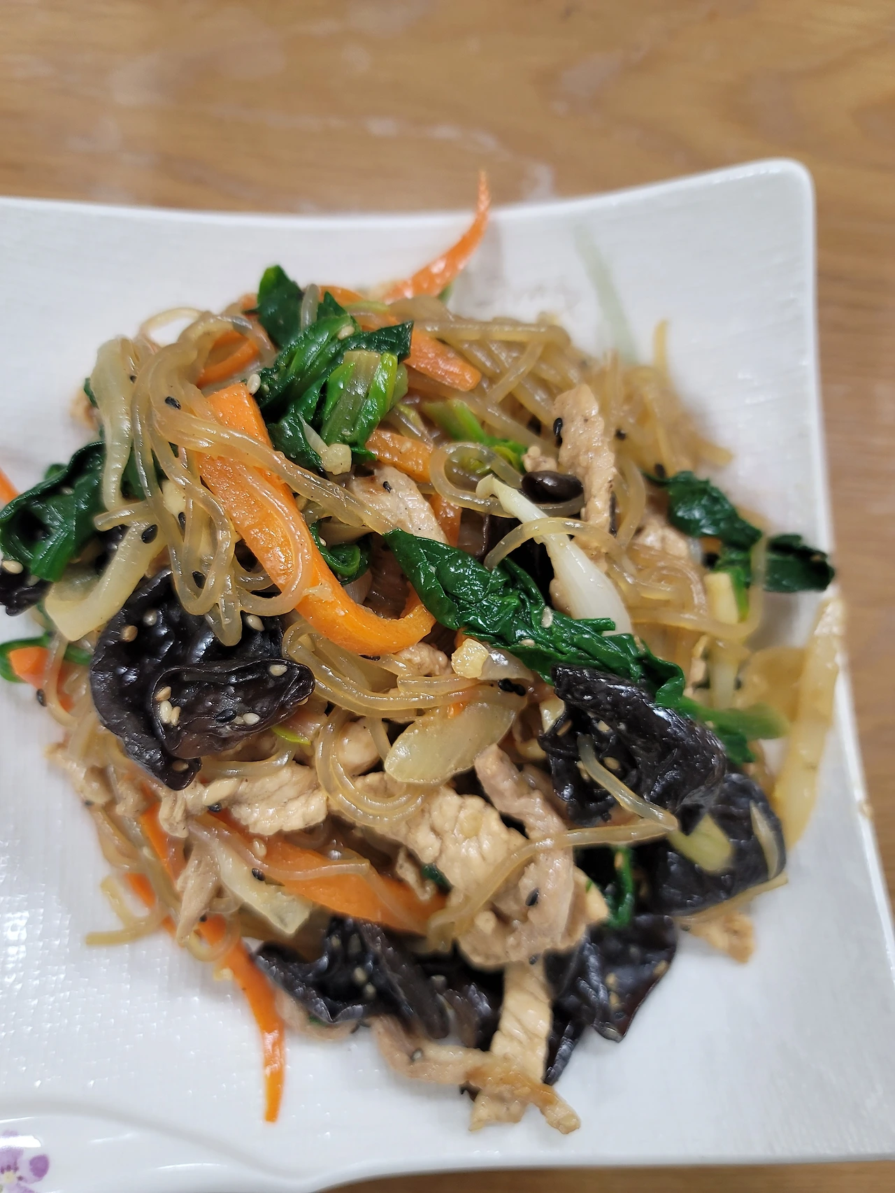 재료; 당면, 돼지 고기,건 목이버섯, 시금치, 당근, 양파, 간장, 설탕, 참기름, 참깨