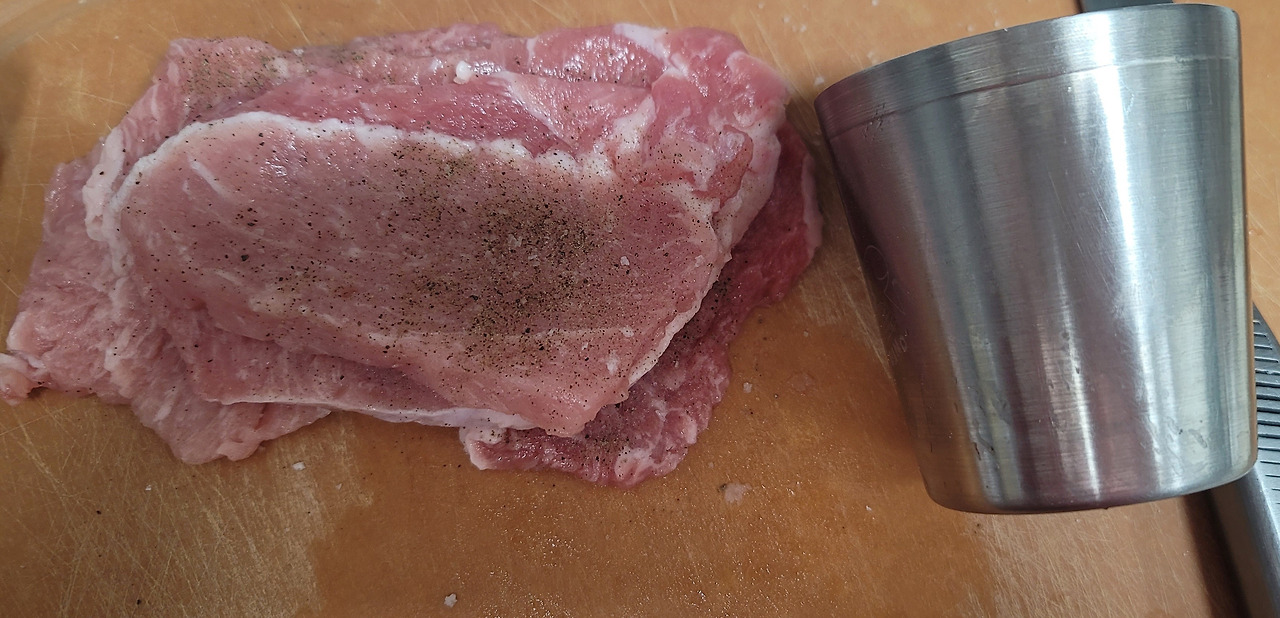 고기 망치가 없어서 스텐컵으로 대신 두드렸다.