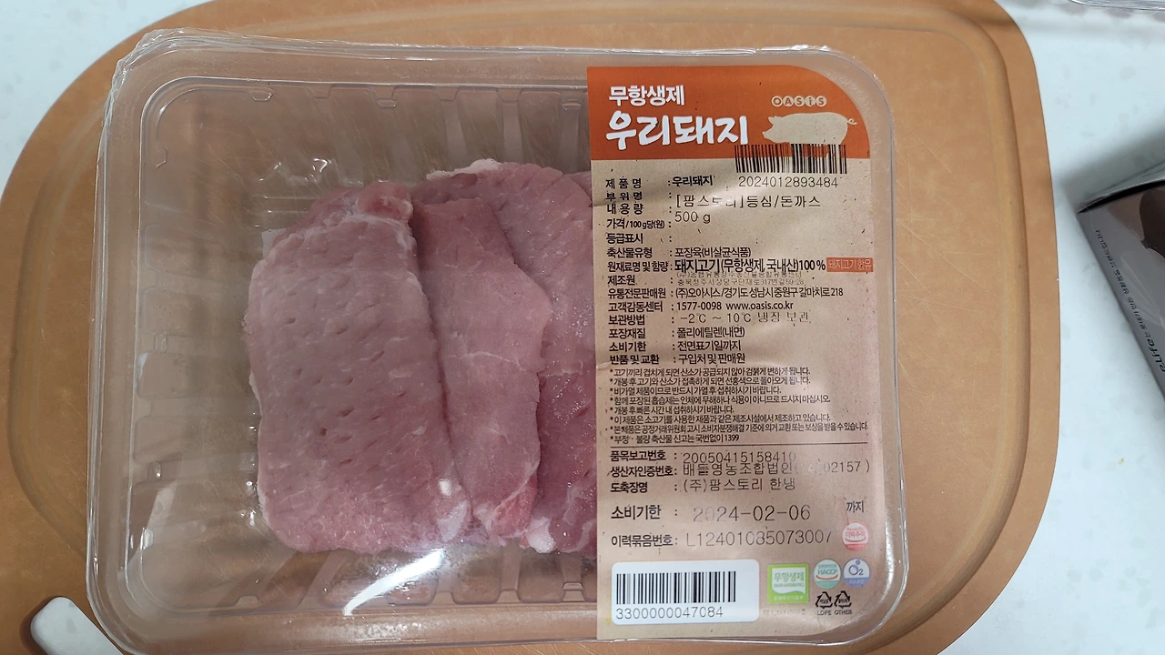 재료 무항생제 우리 돼지 500그람, 계란, 빵가루, 튀김가루, 소금, 후추 약간