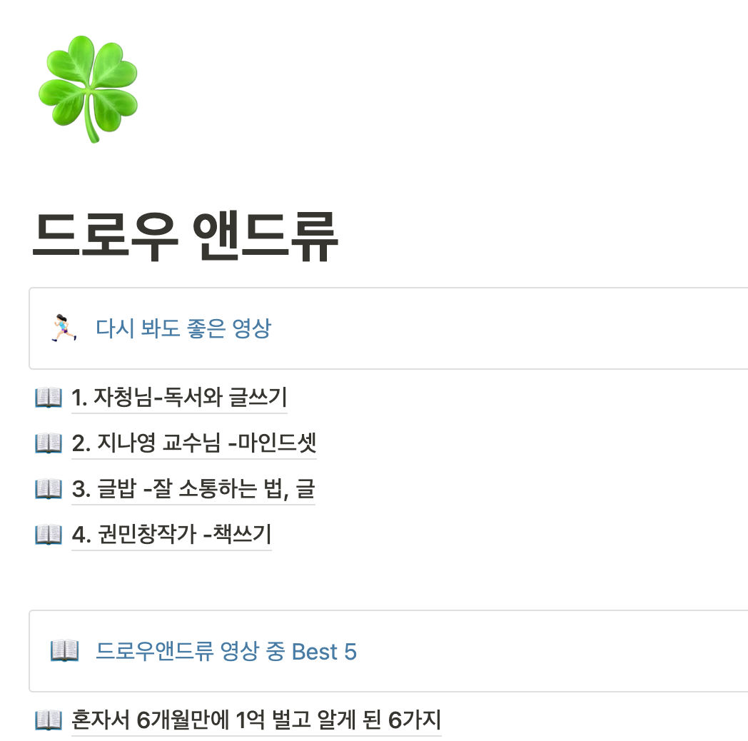 좋은 영상이 있으면 기록해놓고 싶어서 하나씩 작성을 하는데, 유튜브를 보면 멍하니 보게만 된다. 그런 시간이 싫어서 드로우앤드류 유튜버의 영상은 따로 정리를 해놓기도 한다.