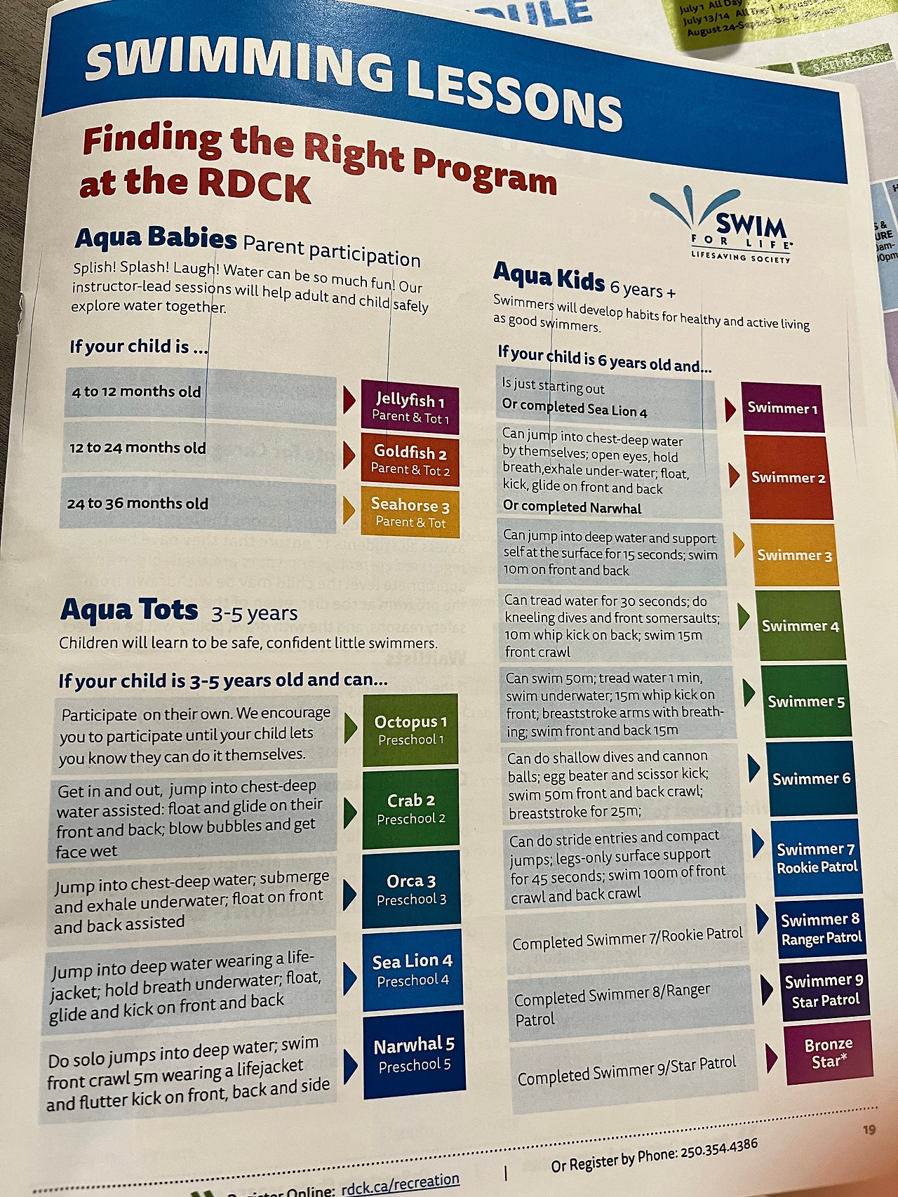 36개월 이하는 부모와 함께 참여하고, 3~5세의 내용은 물에 대한 두려움을 없애고 점점 깊은 물에 점프하는 연습을 한다. 6세 이후에도 가슴 높이의 물에 뛰어들고, 눈을 뜨고, 호흡 연습을 하고 잠수 연습을 하고, 몇 미터 거리까지 몇 초간 수영을 하는지 등등.. 비슷한 듯하면서도 영법에 대해 진도를 구분하여 써 놓지 않은 점이 신선했다.
