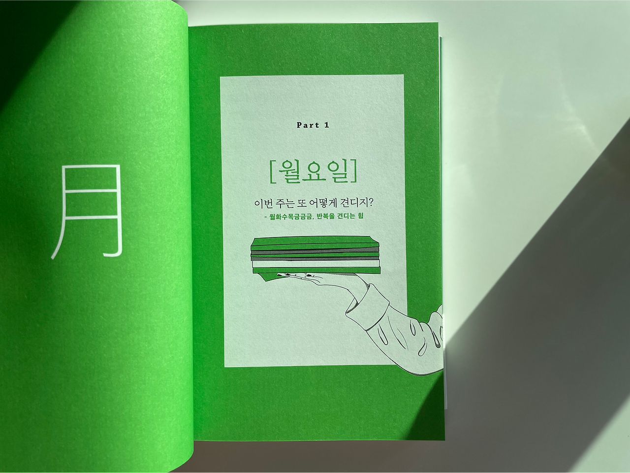 <월요병도 산재처리 해주세요>는 이런 우리의 마음을 일주일의 요일 변화 부드럽게 때론 냉철하게 진단해주고 있다. 반복을 견디는 힘, 작가는 우리에게 똑같이 일어나는 반복적인 일도 어떻게 다른 관점으로 다르게 받아들일 수 있는지에 관해 이야기한다.