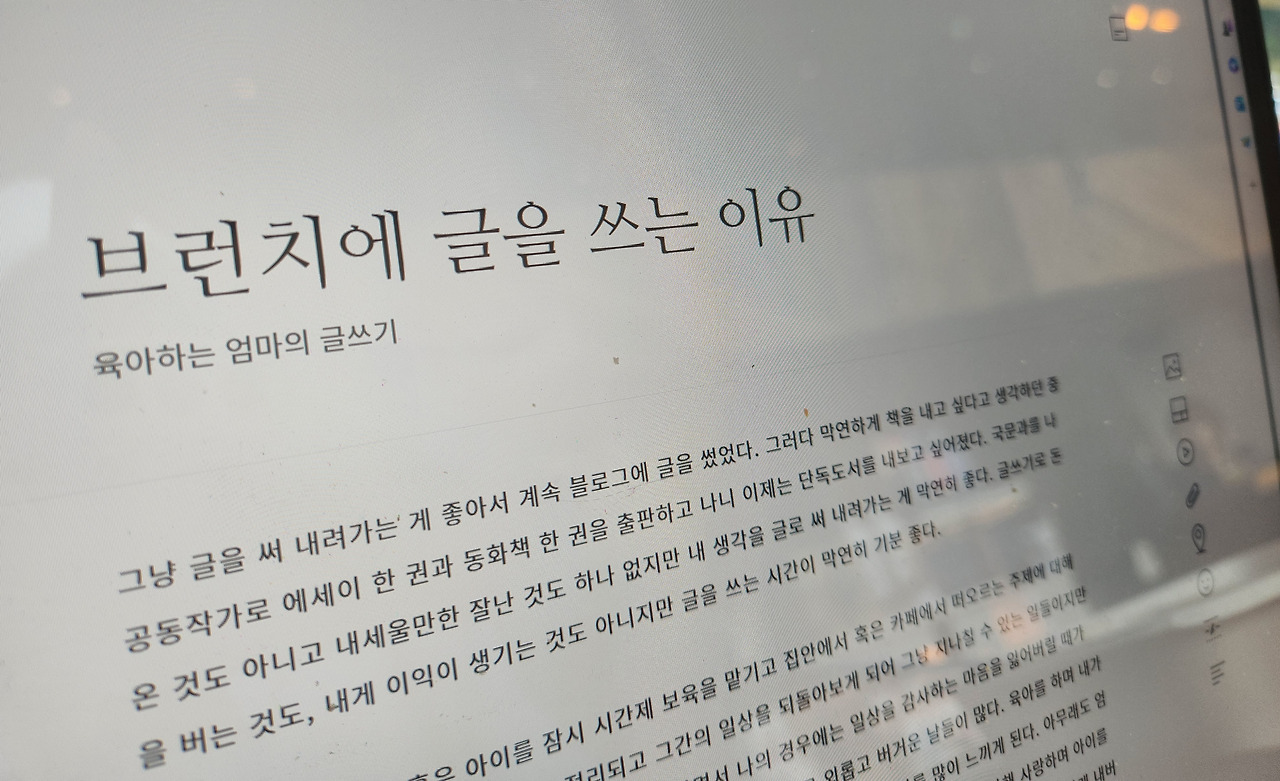 아이가 자는 시간에 혹은 아이를 잠시 시간제 보육을 맡기고 집안에서 혹은 카페에서 숨을 고르고 앉는다. 오늘의 번잡함은 잠시 털어내고 떠오르는 주제를 생각해 본다. 이내 글을 쓰다 보면 생각이 정리되고 하루의 일상을 되돌아보게 되어 그냥 지나칠 수 있는 일들이지만 사소하게 감사함을 느끼게 된다. 특히 육아를 하면서 나의 경우에는 일상에 감사하는 마음을 잃어버릴 때가 많다. 사실 나는 그다지 강한 사람은 아니라 막연히 지치고 외롭고 버거운 날들이 많다. 육아를 하며 내가 이렇게 감정기복이 심한 사람이었나 혹은 내가 이렇게나 부족한 사람이었나를 많이 느끼게 된다. 아무래도 엄마라는 존재는 아이를 낳음으로써 완성되는 것이 아니라 점점 만들어져 가는 일인 듯하다. 만들어지는 과정은 늘 순탄하지만은 않다. 마음을 다해 사랑하며 아이를 케어하고 싶지만 그렇지 못한 순간에는 육아에 대한 기준선은 느슨하게 내려 두고 아이스커피 한잔을 탁상 위에 올려둔다. 그리고는 노트북을 켜 브런치에 글을 써 내려가면 다시금 마음이 느슨해진다.