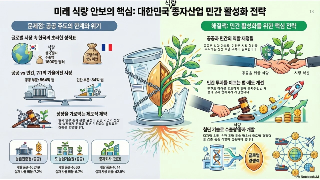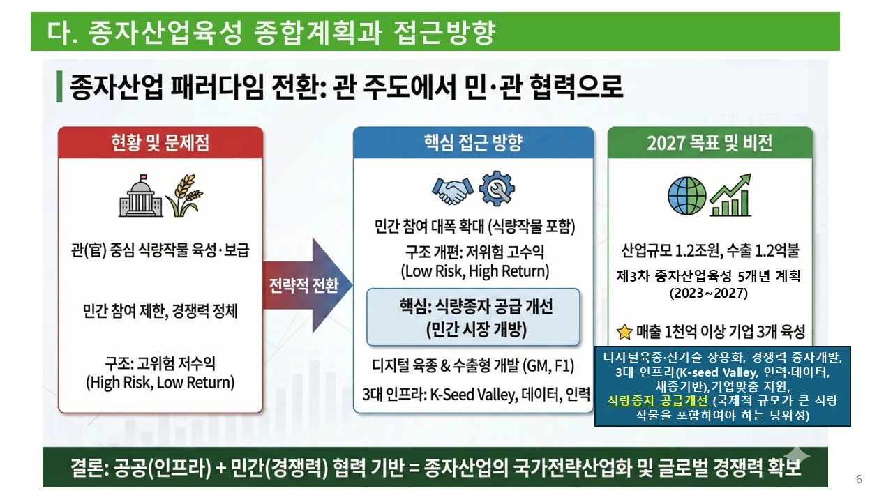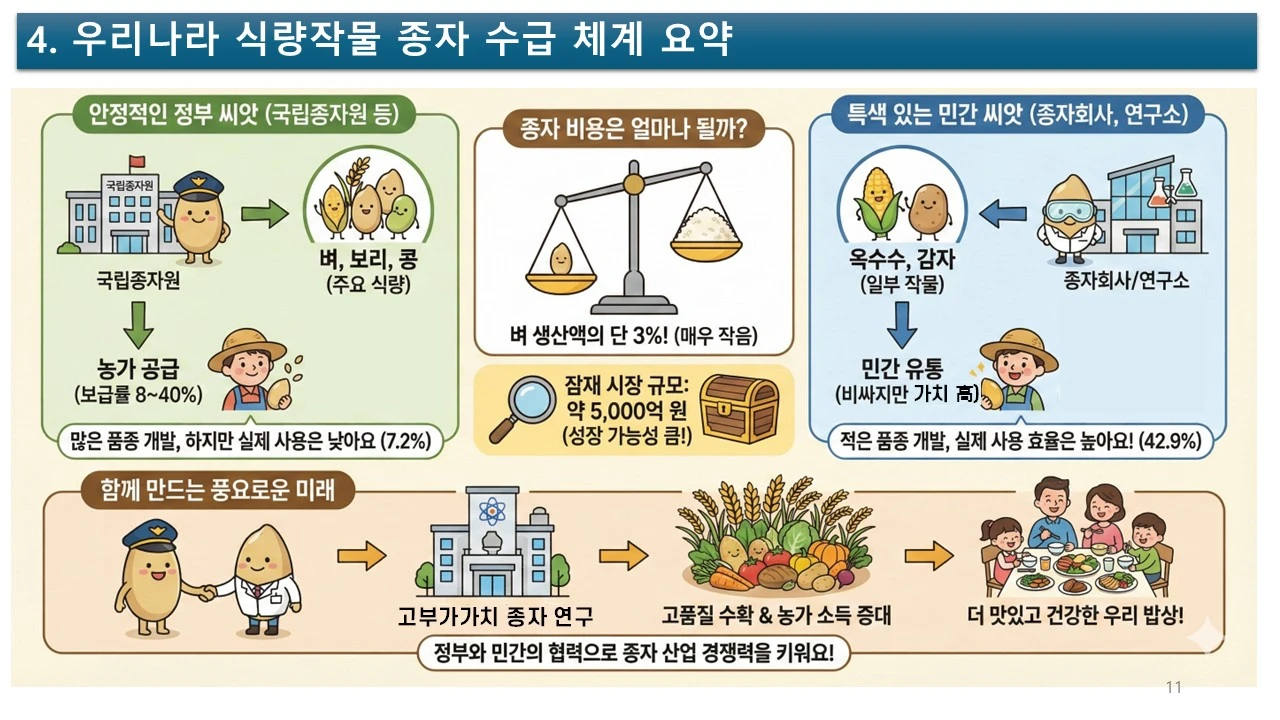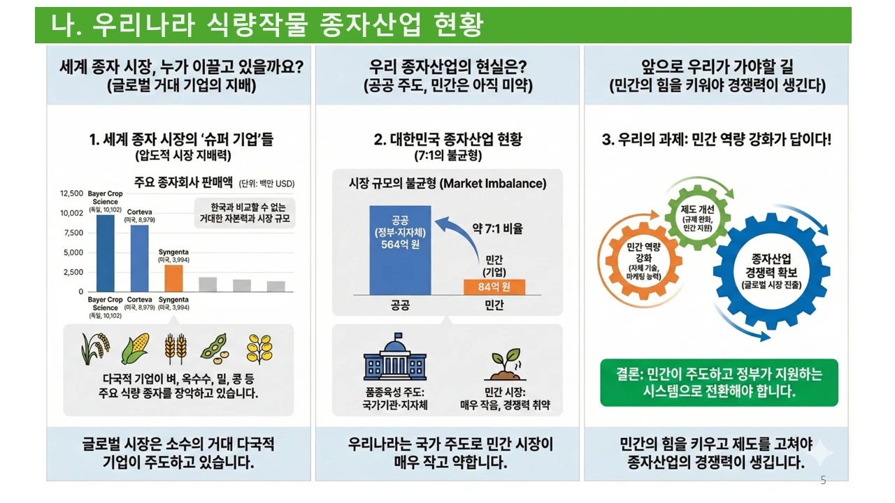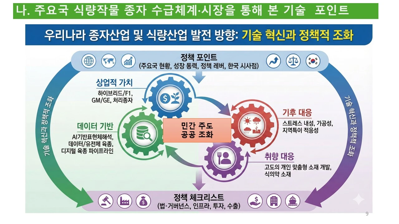 식량을 새롭게 정의하고, 식량 작물의 종자 산업을 활성화하기 위하여, 민간의 힘을 더 강화할 수는 없을까요? 그러려면, 공공기관과 민간 기업의 조화가 필요합니다.