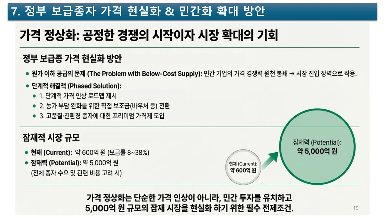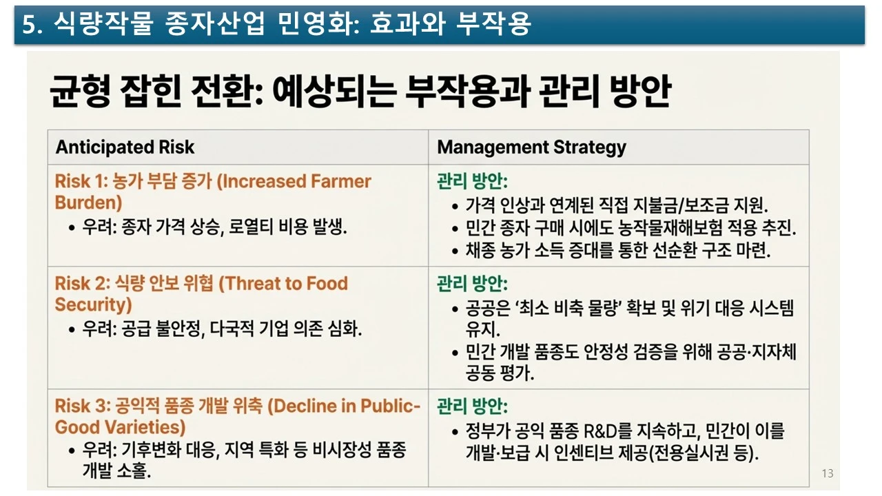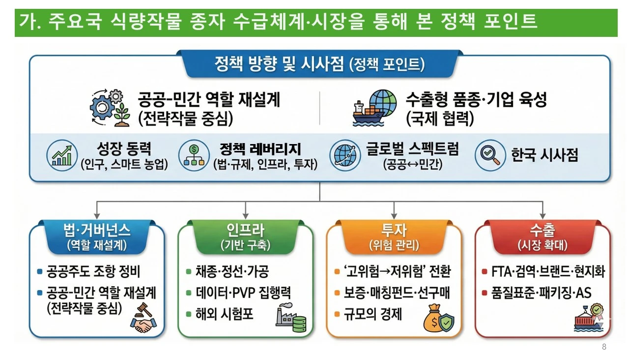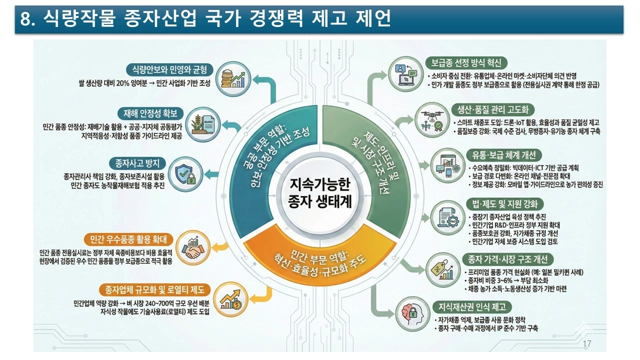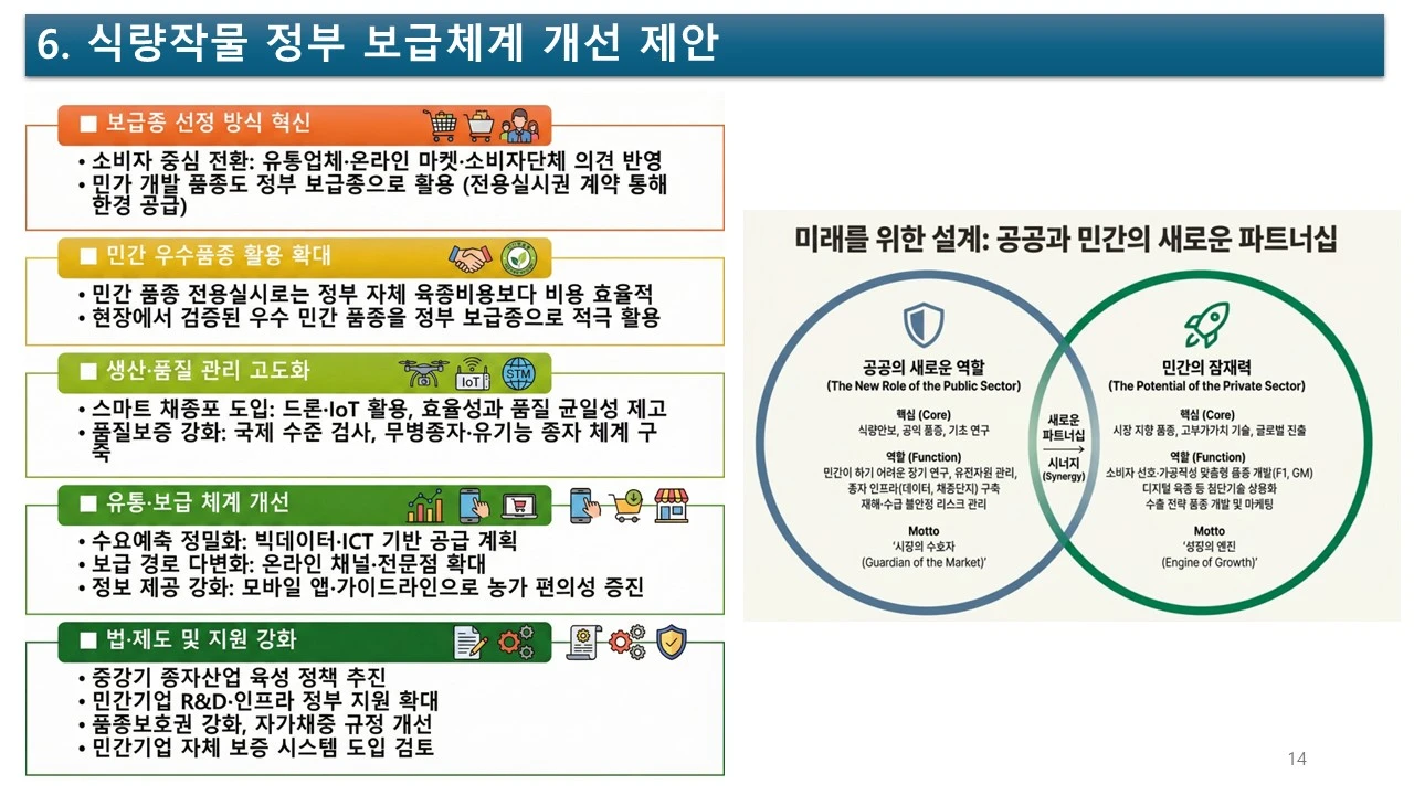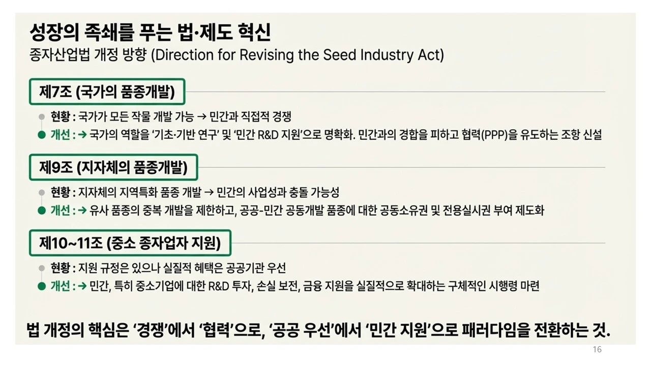 식량을 새롭게 정의하고, 식량 작물의 종자 산업을 활성화하기 위하여, 민간의 힘을 더 강화할 수는 없을까요? 그러려면, 공공기관과 민간 기업의 조화가 필요합니다.