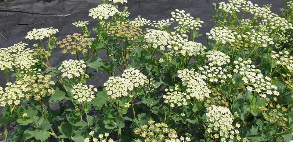 오른쪽 사진의 꽃은 식방풍입니다. 식방풍은 최근 심혈관, 염증에 효과가 있다고 하면서, 채소로도 각광을 받아, 소비가 늘고 있는 기능성 식물입니다.