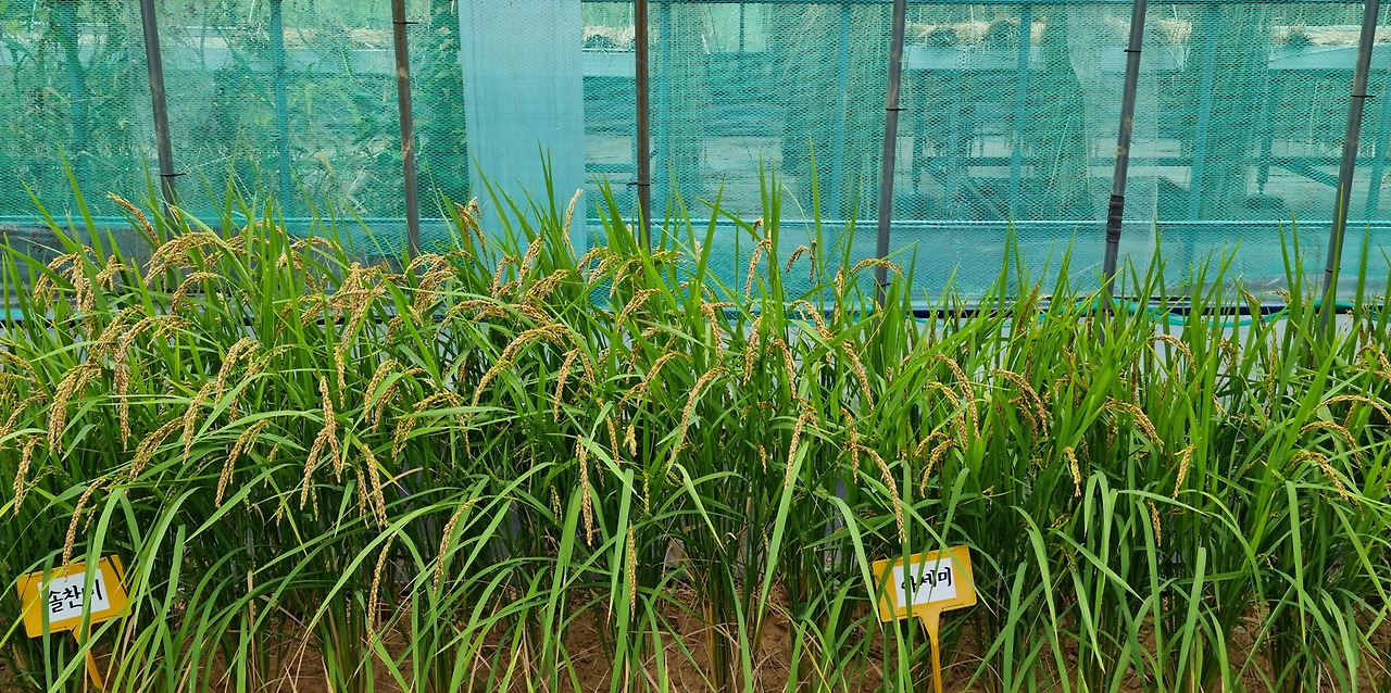 비를 차단한 온실에서 밭 조건으로 위에서 물을 간단 살수만 하는 방식으로 재배한 두 개의 벼를 비교해 보았다. 우리 연구실과 경기도농업기술원에서 공동 개발한 '솔찬미'는 밭의 이랑에 심어 물빠짐이 좋게 하고, 표토에 물기가 남지 않게 살수하여 길러서 정상적인 재배가 가능한 것으로 보인다. 반면에, 이 조건에서 기존의 아세미의 이삭은 솔찬미보다 작고 종자의 수가 적다.