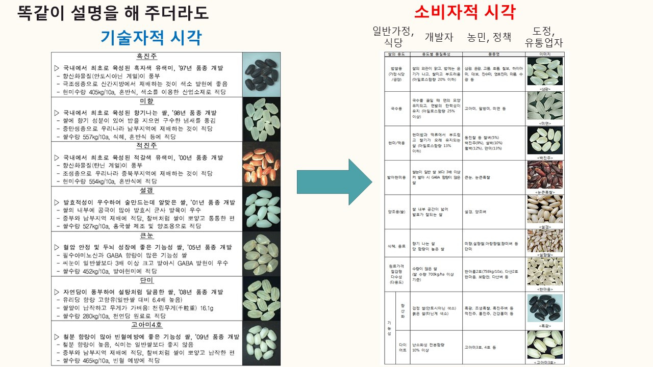 나아가 '어떤 밥을, 그리고 어떤 쌀을 소비자가 원하나?'라는 질문으로 치환되며, 소비자가 원하는 밥을 만들기 위한 '나만의 쌀 품종'은 도대체 무엇인가가 더 관심사였다. 소비자는 어떤 기능이 있는지에 관심이 적다는 것을 말하고 싶다. 소비자는 쌀에게서 어떤 것을 원하는 것일까?