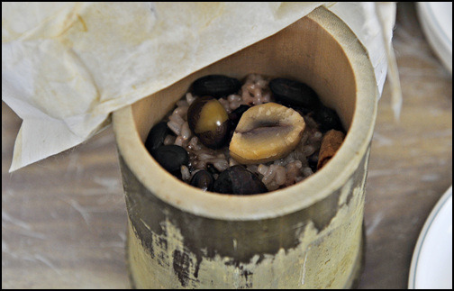 "멥쌀, 찹쌀, 흑미, 검은콩 등을 깨끗하게 씻어서 물에 충분히 불린 뒤 은행은 팬에 기름을 조금만 두르고 흔들어 가면서 파랗게 볶아 내어 종이 타월로 속껍질을 제거하고. 밤은 껍질을 벗겨 2등분이나 4등분으로 자르고, 잣은 고깔을 제거해서 준비하고, 대추는 반으로 갈라 씨를 발라내고 4등분 합니다. 대나무에 불린 쌀과 콩을 넣고, 그 위에 은행, 밤, 잣, 대추 등을 올린 후(내용물이 통의 절반을 넘지 않도록 담고), 소금 간을 한 물을 재료 위 2cm까지 붓습니다. 그런 다음 대나무 통을 한지로 덮고 종이끈으로 묶어 압력솥에 넣고 찐답니다."