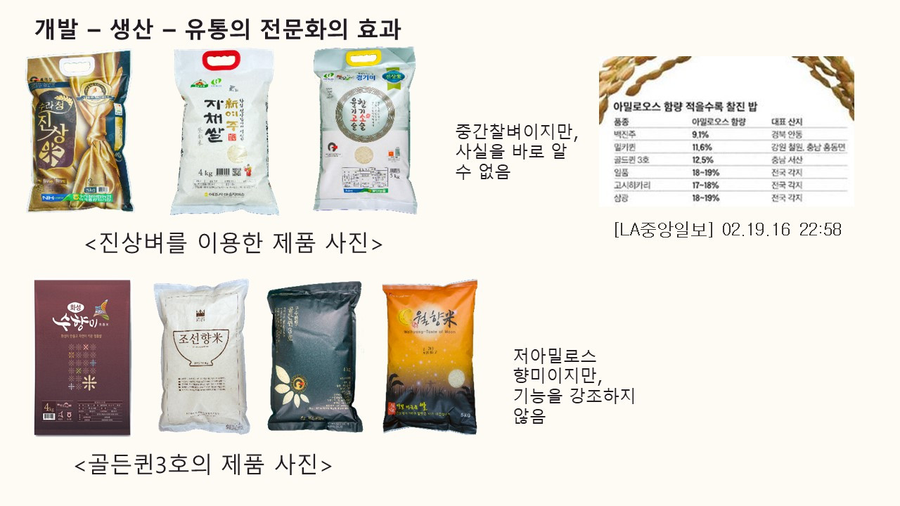 그런데, 이 모든 것들이 지금처럼, 생산품의 특징을 효과적으로 전달할 수 있는 '온라인 플랫폼'이 없었다면 가능했을까? 그런 시대가 왔고, 그런 상품들이 잘 팔리는 시대이기 때문에 가능했던 면도 있다. 그리고, 이제는 다양한 형태의 소비자 취향 분석을 통한 기존 쌀 품종과 앞으로 개발될 쌀 품종에 대한 '소비자 시각의' 프로파일링이 엄격하게 진행되어, 그 정보가 생산자와 소비자에게 제공될 필요가 있다.
