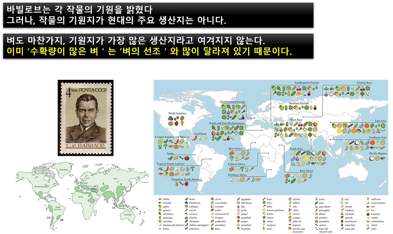 작물의 기원지를 밝힌 것으로 유명한 바빌로프 박사는 각 작물의 기원 지를 밝혔고, 많은 곡물들이 열대지방 또는 온대지방 유래(콩, 밀, 옥수수를 보세요)로 생각합니다. 벼는 동남아, 남아시아 기원일 것으로 보았는데, 실제 기원지 지역은 열대우림이라기보다는 건기/우기가 명확하며, 오히려 스트레스가 매우 많은 벵갈 지역과 네팔 산간으로 보는 견해가 더 우세합니다.