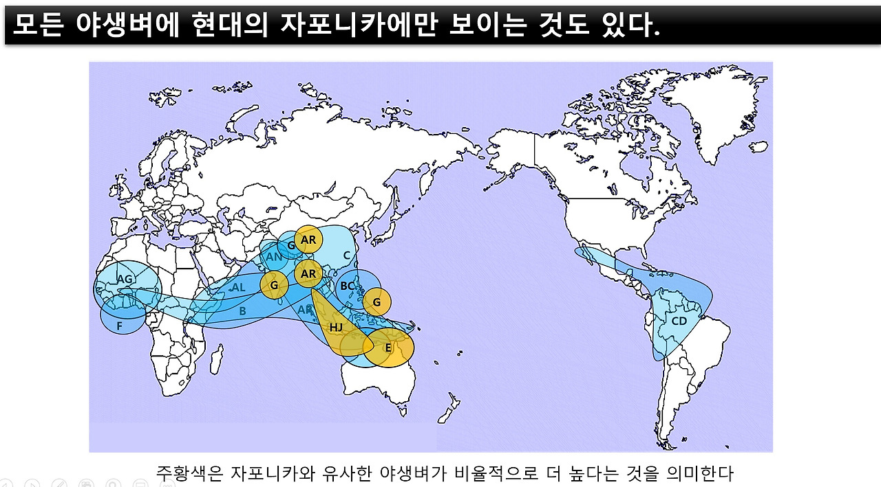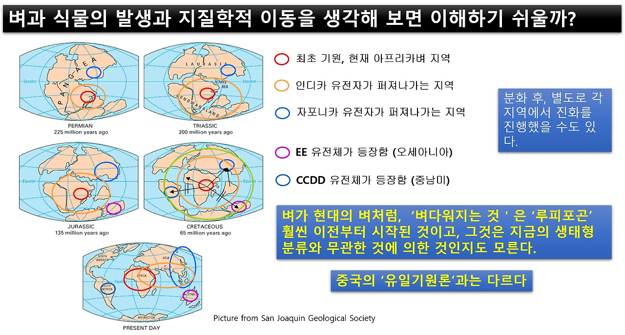 첫 번째 그림을 보면, 현재의 인도/동남아 일부 지역에 해당하는 곳에 이미 온대벼인 자포니카 염색체 단편이 있었다는 것이죠. 최초기원지와 인디카 단편이 많았던 어떤 벼과 식물은 대륙 이동 때문에 더 많이 복잡하게 퍼지게 됩니다.