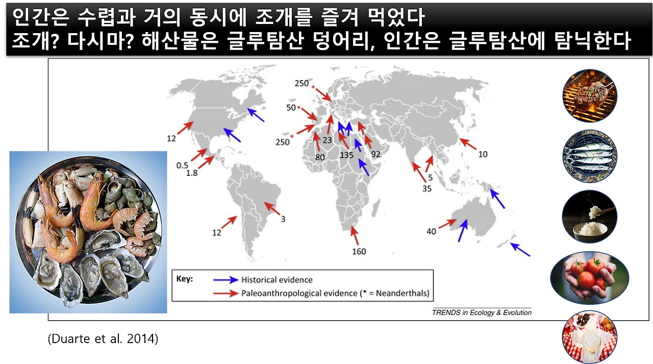 원래 인간이 제일 먼저 먹기 시작한 것은 육류, 골수, 그러다가 조개, 그런 식입니다. 그런데 가만히 생각해 보면, 침이 고이게 하는 식품들을 잘 보자면, '감칠맛'이 그 핵심적 맛임을 알 수 있습니다. 열량과 관련된 가장 중요한 맛은 본래 '단맛'이겠지요. 그런데, 식욕을 돋우는 맛은 실제로 '감칠맛'입니다.
