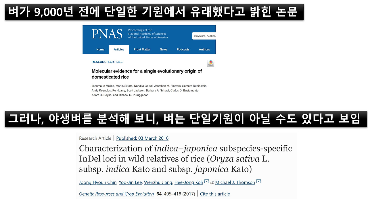 벼라는 '식물의 기원지'와 '벼의 재배기원지'는 다를 수밖에 없습니다. 벼를 본격적으로 재배하려면, 벼를 기르는 체계적인 시스템이나 유적지의 문명 발달 경로, 그리고 동시에 출토된 유물들, 종자의 보관상태, 유적의 지리적 연속성 등의 많은 정보가 필요할 것입니다. 단순히 한두 가지 방법이나 유전체 분석 만으로는 쉽지 않습니다. 다시 말해, '식물학적'인 것만으로는 해석이 안되기 때문이죠.