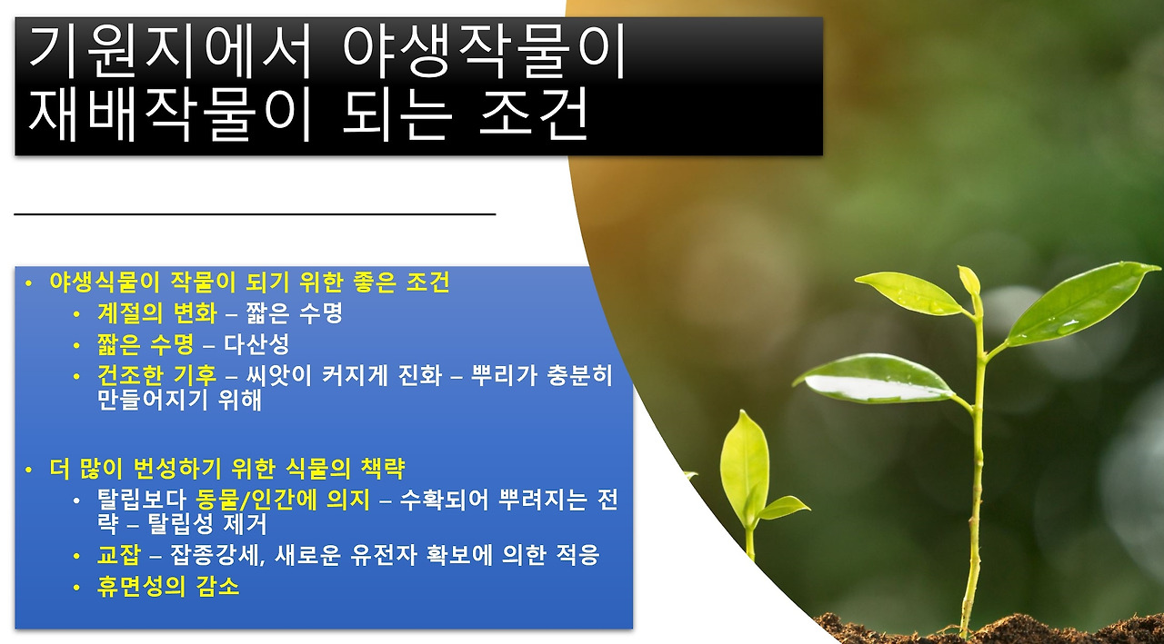 그리고, 마지막으로 야생성이 재배특성으로 변하여, 사람들에게 재배될 수 있으려면 어떤 환경이어야 할까요? 얼핏 생각하기에 열대지방 같은 곳에서 재배화가 가속되었을 것으로 생각하는데, 특히 종자식물의 경우에는 건조하여야 뿌리가 건강한, 즉 종자크기가 적당히 커지는 식물이 됩니다. 그래야, 종자를 먹으려는 포식자에 의해서 선발되고, 그것이 인간이라면 드디어 재배되기 시작할 것입니다. 따라서, 재배 기원이 되는 좋은 조건은 사계절이 있고 건조하며 척박한 환경이 종종 찾아오는 온대지방이 되었을 것이라고 생각합니다.
