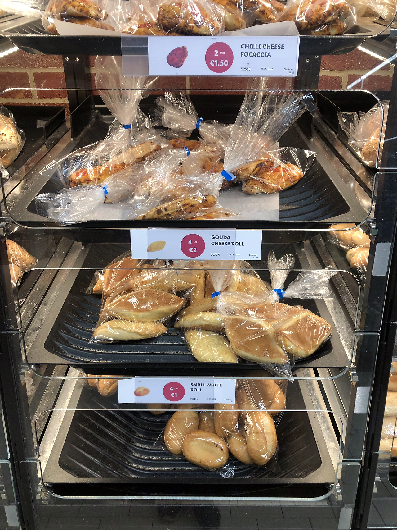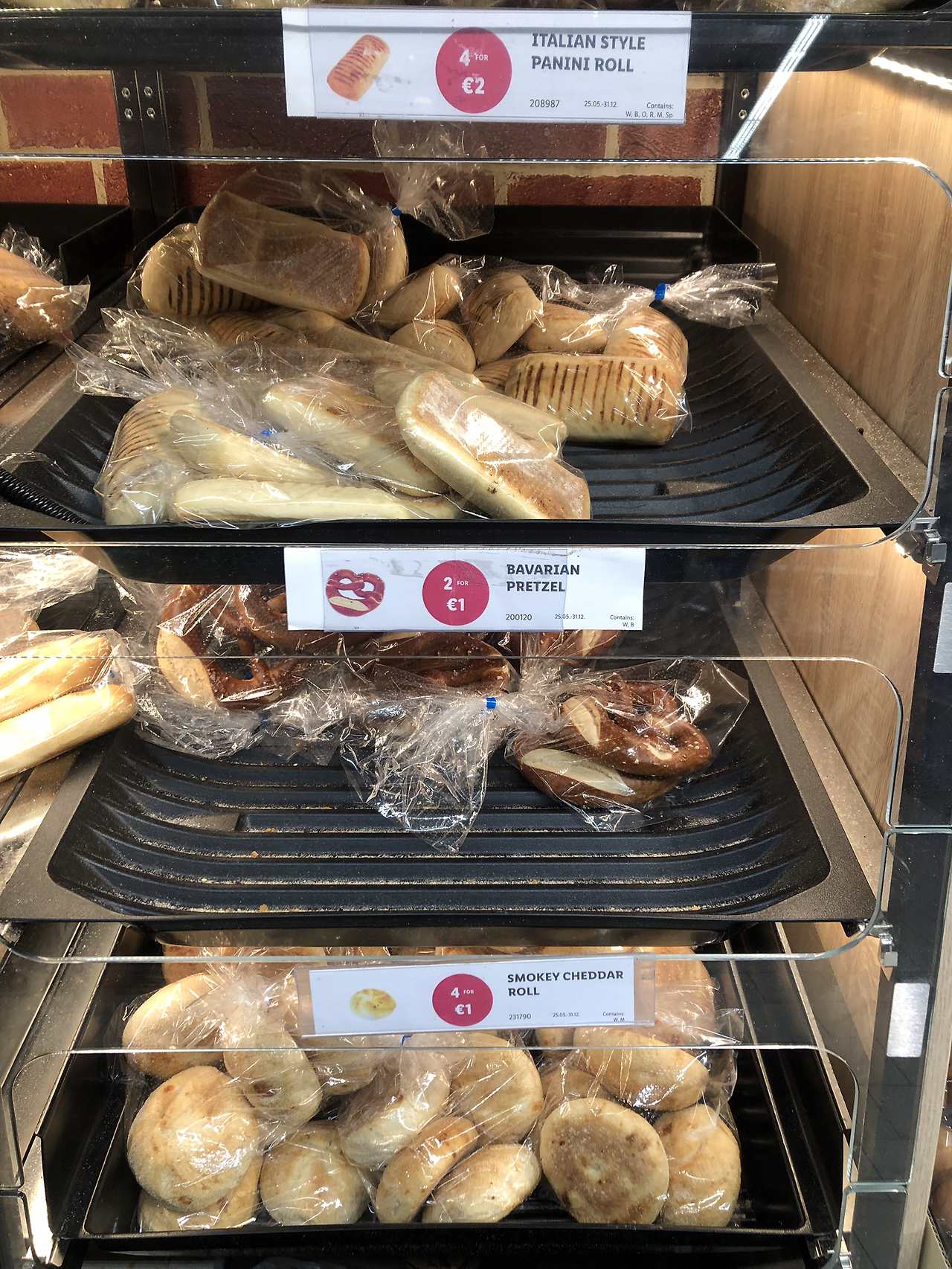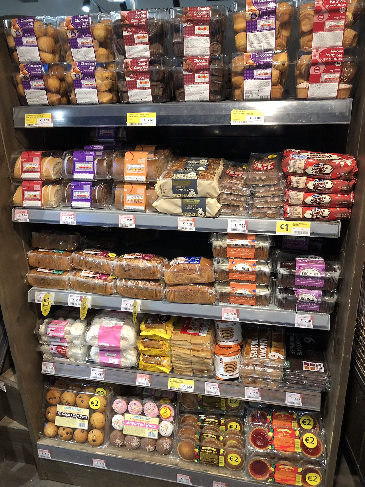 마트에서 판매되는 공장에서 만든 빵도 빠질 수 없다. 식빵뿐만 아니라 롤케이크, 와플, 머핀, 파운드케이크, 팬케이크 등 선택지가 많아서 고르기가 어렵다. 식빵은 보통 1유로(절반 아님 통으로), 사워도우 식빵은 1.5유로 정도(더 많이 먹을 수 없는 내가 슬퍼지게 만드는 가격)이며 오히려 첨가물이 더 많이 들어간 디저트류 빵이 가격이 높았지만 그래도 2-3유로대 가격에 구매할 수 있었다. 그러나 이런 종류의 빵들은 경험상 썩지 않는다. 즉 첨가물이 많이 들어있다는 걸 쉽게 느낄 수 있다. 유통기한이 6월까지 였던 와플은 8월이 훌쩍 넘어서까지 멀쩡해 보여 맛을 보았더니 여전히 맛있었고, 덜 달겠지라고 골랐던 당근케이크는 한 입 먹자마자 너무 달아서 미간이 좁혀질 정도였다.