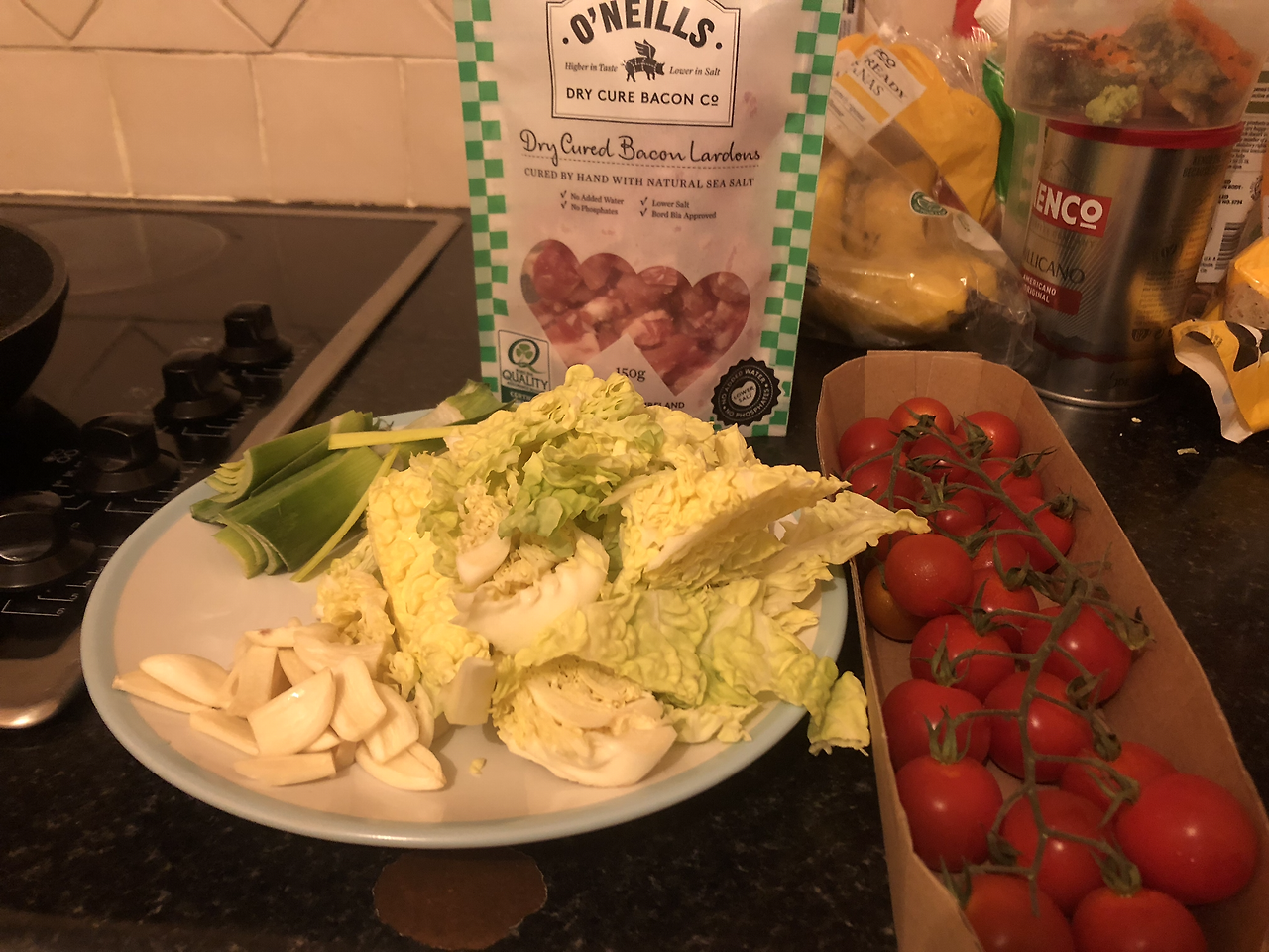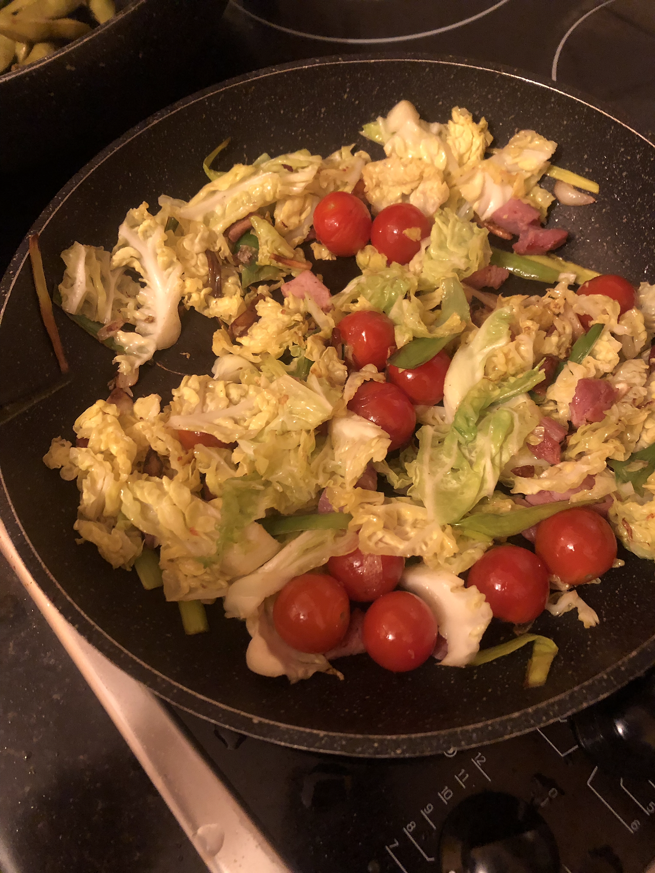 달궈진 팬에 올리브유를 두르고 마늘과 베이컨을 충분히 볶아준다. 어느 정도 갈색빛이 나면 토마토를 넣고 볶다가 마지막에 양배추의 숨이 약간 죽을 때까지 볶아주면서 소금을 살짝 뿌려주면 완성이다. 초간단해 보이지만 맛이나 식감은 훌륭하다.
