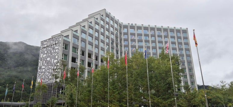 케이블카 창밖으로 붉게 물든 산맥이 펼쳐집니다.