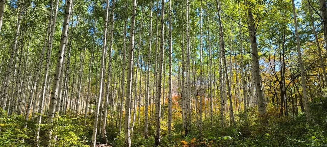 하얀 나무들이 빼곡히 선 자작나무숲이다.