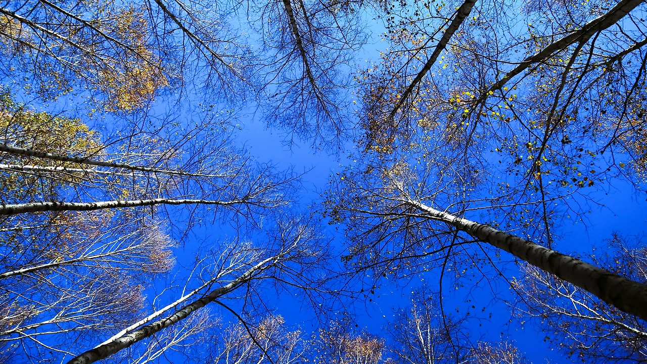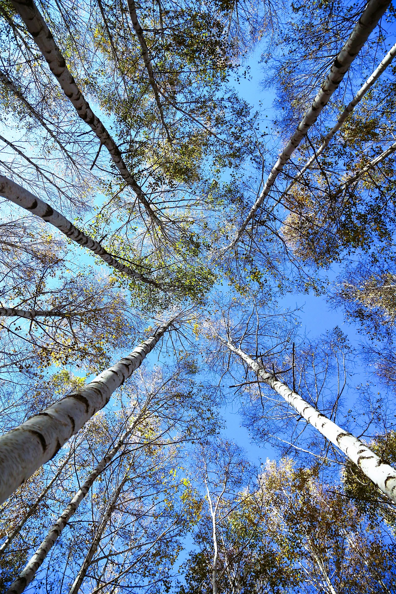 하얀 나무들이 곧게 하늘로 뻗어,