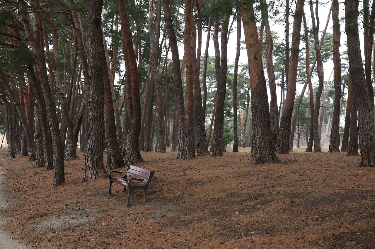소나무숲 의자에 오랫동안 앉아 있으며