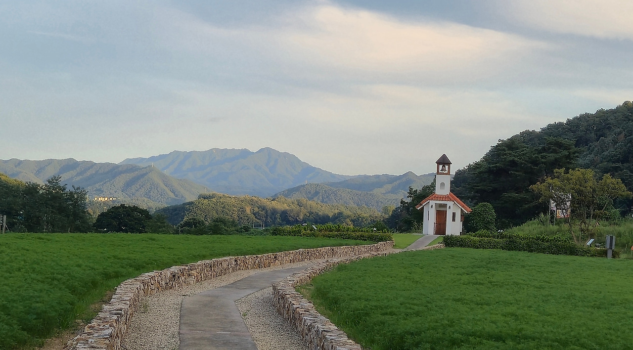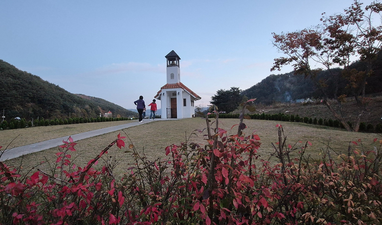 홍천군 북방면, 드넓은 초록 들판 한가운데 하얀 종탑이 보입니다.
