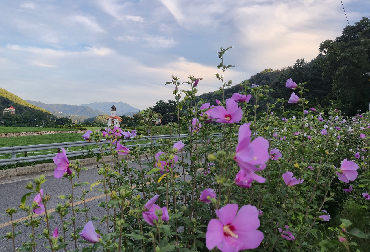 종탑 너머로 보이는 산줄기와 파란 하늘, 그리고 발아래 끝없이 이어진 무궁화밭.