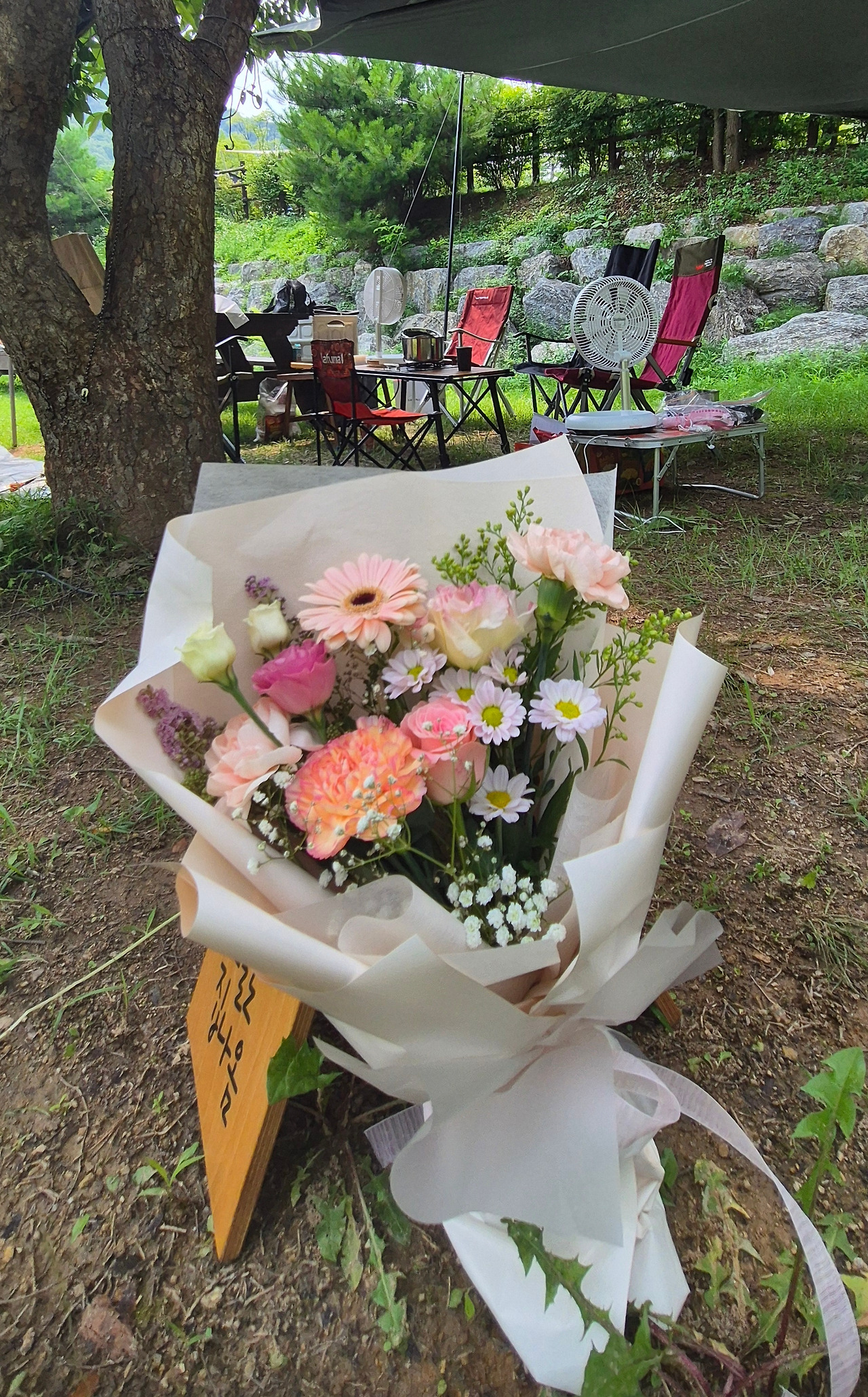 나무 그늘 아래 걸린 텐트 앞, 작은 꽃다발이 놓여 있었다.