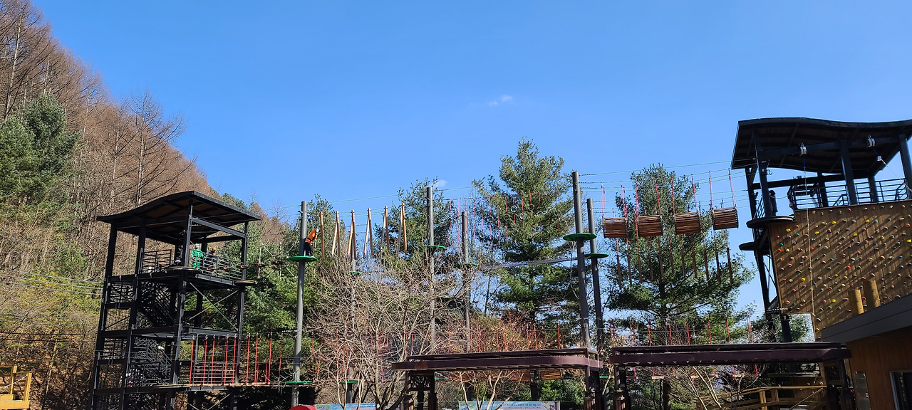높게 뻗은 나무 데크와 짚라인, 공중 그물 타기까지—