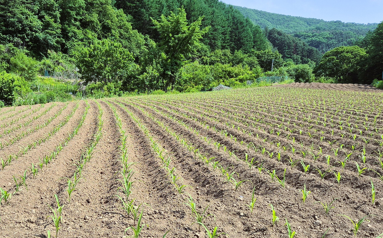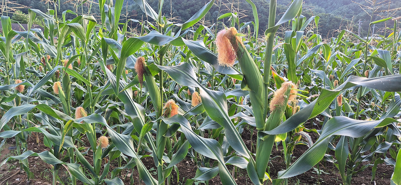 여름의 홍천 들녘에는 초록빛 옥수수밭이 끝없이 이어집니다.