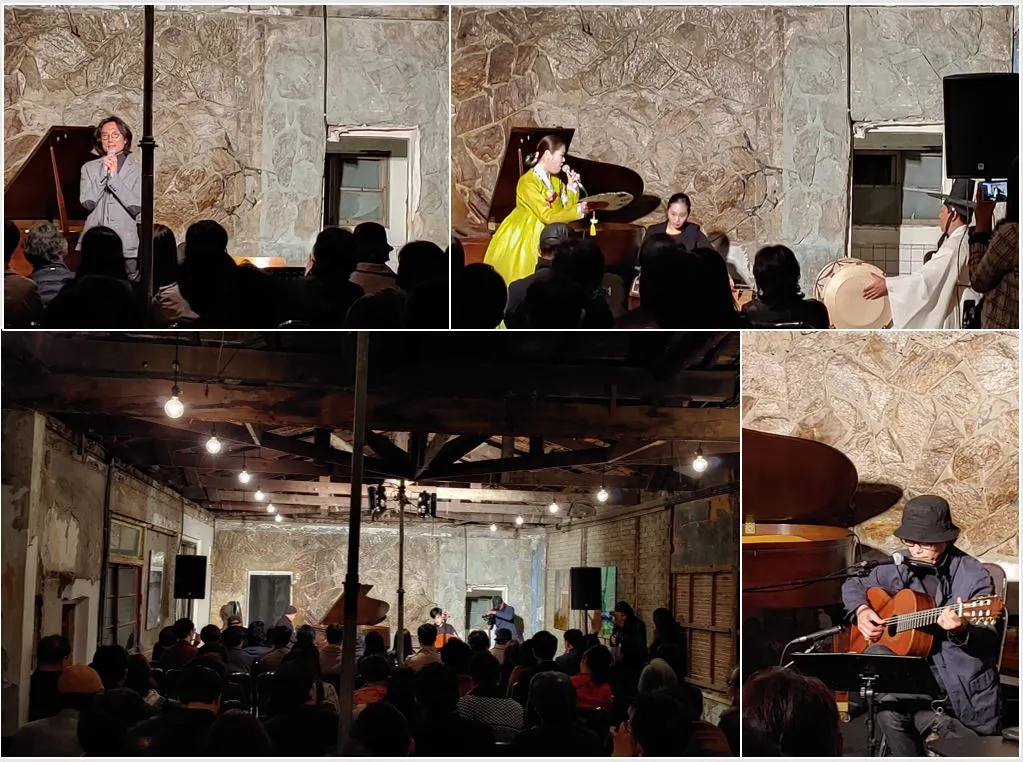 해가지고 어둑해지고 날씨도 차가워져 음악을 듣기에 딱 좋은 시간이 되자 이 프로젝트를 진두지휘하고 있는 파라디소 송성진 사장의 인사말로 공연을 시작한다. 재즈피아니스 임인건, 첼리스트 송상우, 포크가수 김두수, 소리꾼 김금희 모두 군산에 적을 두고 있는 예술가들이 들려주는 음악은 피아노와 첼로, 포크 음악까지 허름하지만 아늑한 공연장에 너무나 잘 어울렸다. 의외의 발견은 판소리도 이런 공간에서 관객과 같이 소통할 수 있다는 것을 확인할 수 있었다. 판소리야말로 국악한마당 같은 거창한 프로그램보다 사람들과 같이 부르고 웃을 수 있는 이런 동네의 공연장이 필요한 게 아닌가 싶다.