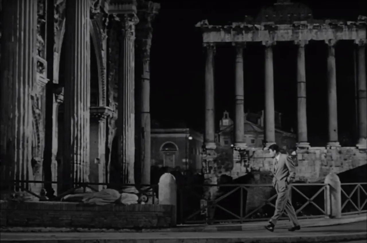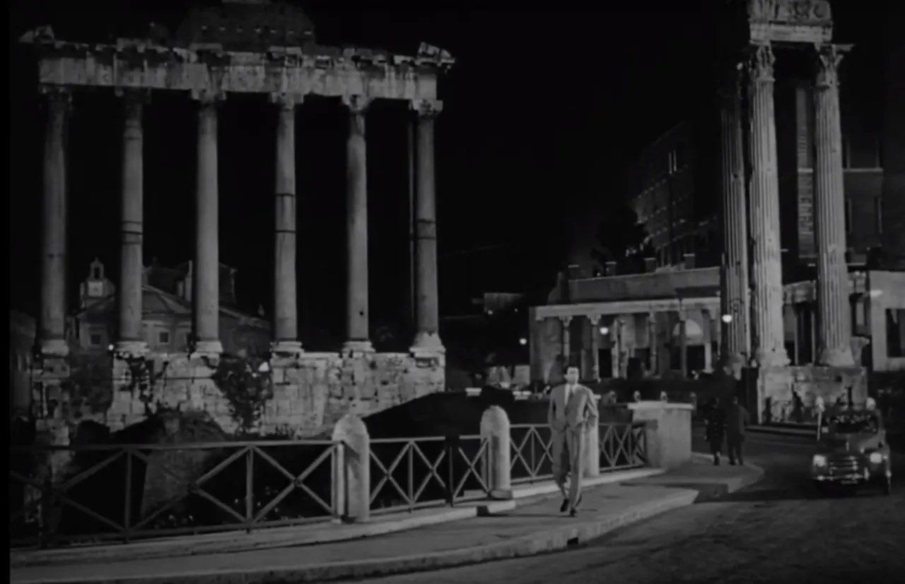 조는 밤 늦게 집에 가는 도중 길거리 벤치에 누워있는 앤 공주를 발견합니다. 이 장면을 찍은 길은 콜로세움 옆 포로 로마노인데 이 영화를 찍은 것은 1953년 이후 포로 로마노는 계속 발굴되었고 지금은 스크린에서 보이던 풍경과 달라졌습니다. 영화에 등장한 길은 기둥만 남아있는 사루투느스 신전과 베스파시아누스 신전사이에 있던 자동차길인데 이후 발굴이 진행되면서 이 길이 사라지고 밑으로 파 내려가 포로 로마노 내 관람로가 되어 있지요. 지금은 휠씬 뒤쪽 캄피돌리오 광장쪽으로 길이 옮겨져 있습니다.