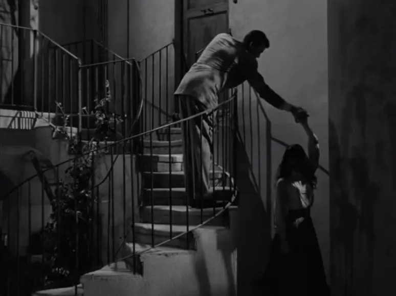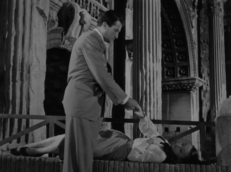 로마에 휴일에서는 조가 수면제에 취한 앤공주를 방으로 데려가려고 나선형 이층계단으로 손을 잡고 데려가는데 조는 이층으로 앤 공주는 계단옆 일층으로 그냥 지나쳐 가자 마치 춤을 추듯이 앤공주의 손을 잡아끌어 돌아서게 한 뒤 계단으로 인도하는 장면이 기억에 남습니다. 또 이층에 올라와 옆집 문을 두드리려는 앤을 겨우 붙잡는데 마치 뮤지컬의 한 장면 같지만 웃음이 절로 나오는 부분이죠.