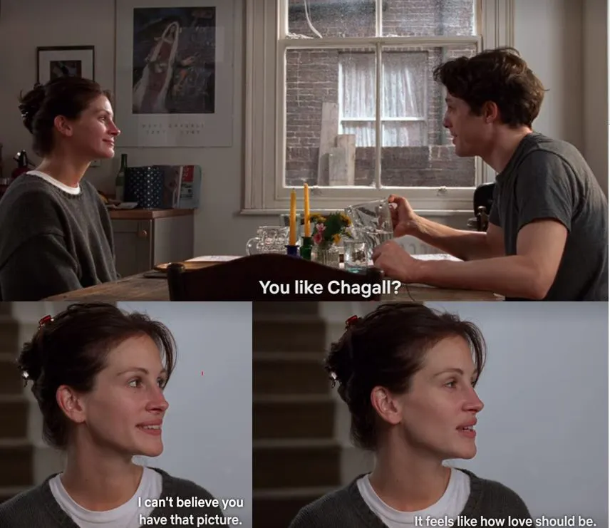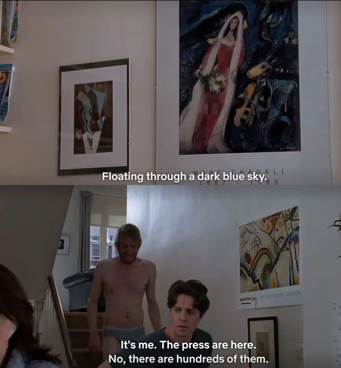 개인적으로는 휴 그랜트의 집안이 흥미로웠는데 그림을 통해 서로의 취향을 확인하는 장면에서 벽에 걸린 Chargall의 신부(La Mariée)와 Huan Gris의 Guitar and glass, 그리고 속옷만 걸친 친구가 계단을 내려올 때 옆에 걸려있는 Kandinsky 작품이 눈에 띄더군요.