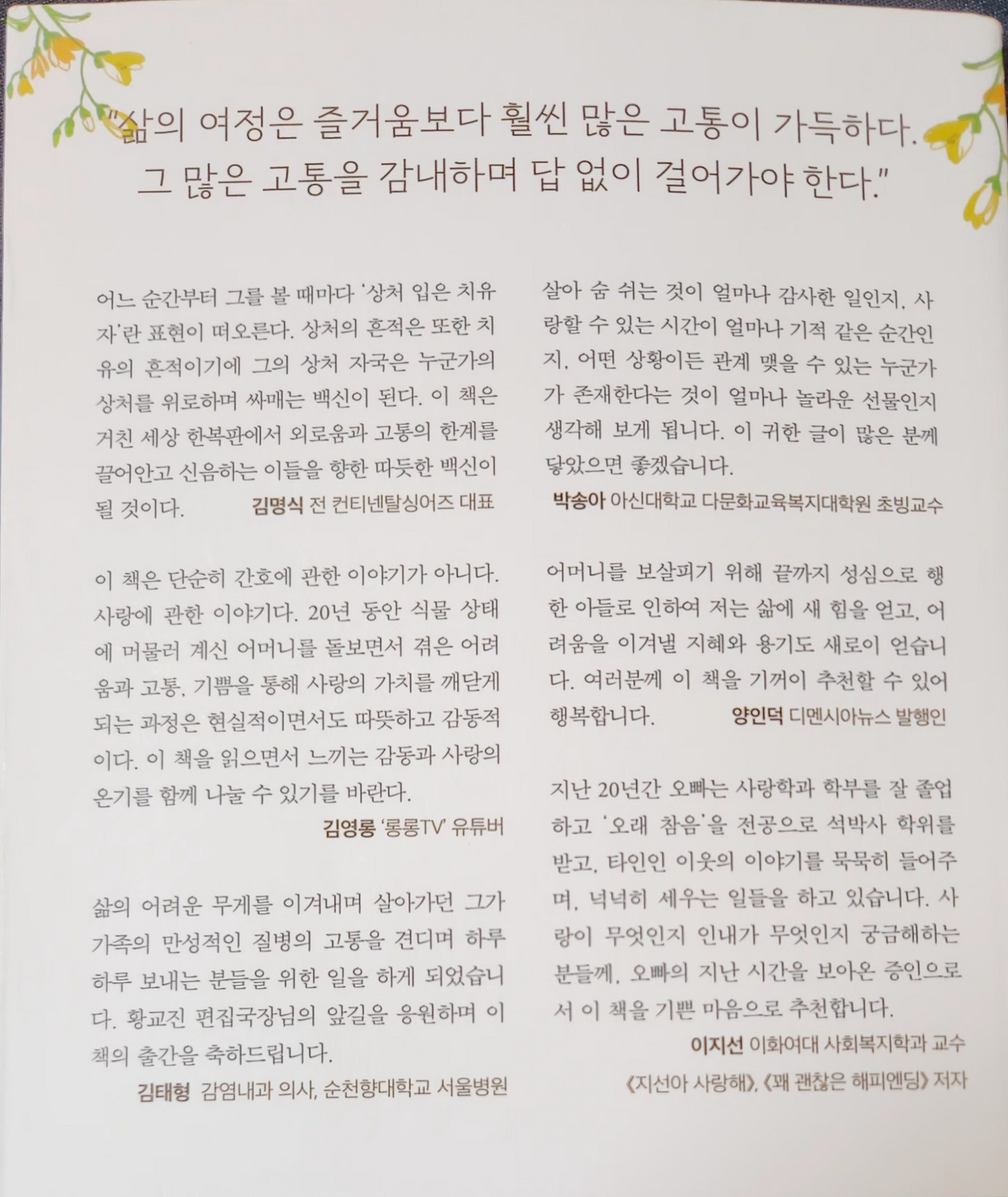 이렇게 많은 뇌출혈 환자들이 있고 간병하는 가족들이 있지만, 이 책의 특별함은 내가 병실에서 느꼈던 어두운 감정이 아니라 그렇게 어렵고 긴 간병 기간을 감사함으로 이겨낼 수도 있다는 점을 대중들에게 소개한다는 점이다.