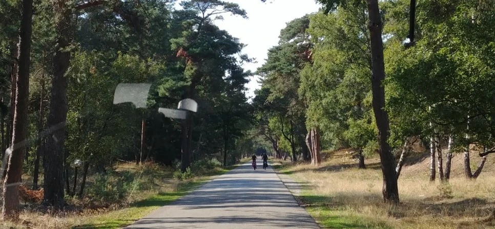 주변 숲길에서 자전거로 이동하는 방문객들