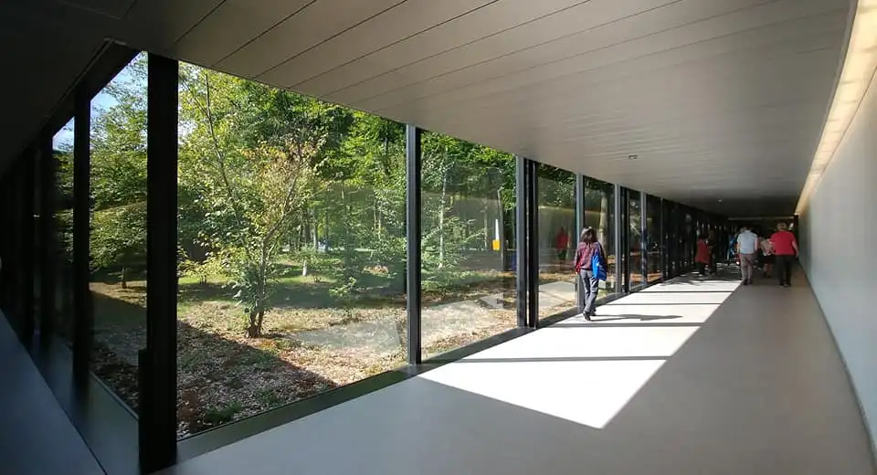 조각공원으로 둘러싸인 낮은 다각형 건물로 복도가 유리로 개방되어 있어 주변 경관이 자연스럽게 들어오는데 상당히 세련되고 멋스럽습니다.