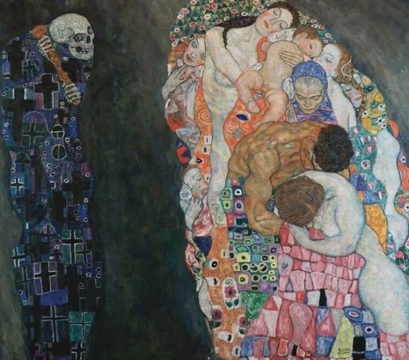 클림트의 <죽음과 삶>이다. 그림 속, 죽음으로 상정되는 해골은 삶을 향해 감정을 자아내는 표정을 짓는다. 반대로 삶을 표방하는 인간들은 죽은 것처럼 잠들어 있다. 삶에서 죽음이 나타나고, 죽음에서 삶이 드러난다. 클림트는 죽음과 삶을 대칭적으로 여기는 사고방식에서 벗어난다. 그는 죽음과 삶이 하나의 세계 안에 공존함을 나타낸다. 삶을 살아내는 사람들은 잠을 잔다. 하루가 잠을 향해 달려가듯, 잠을 자야 하루의 생이 이어지듯, 삶은 죽음이라는 끝을 향해 지속된다. 삶은 죽음으로 완성되며, 생은 잠으로 완성된다. 잠은 삶에서 맞이하는 순간의 죽음인 것이다.