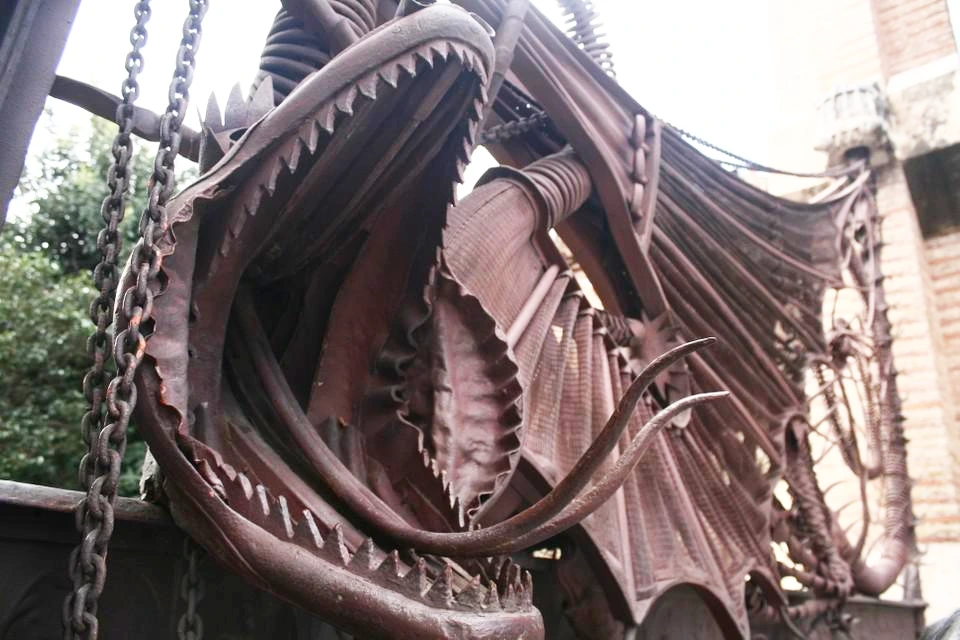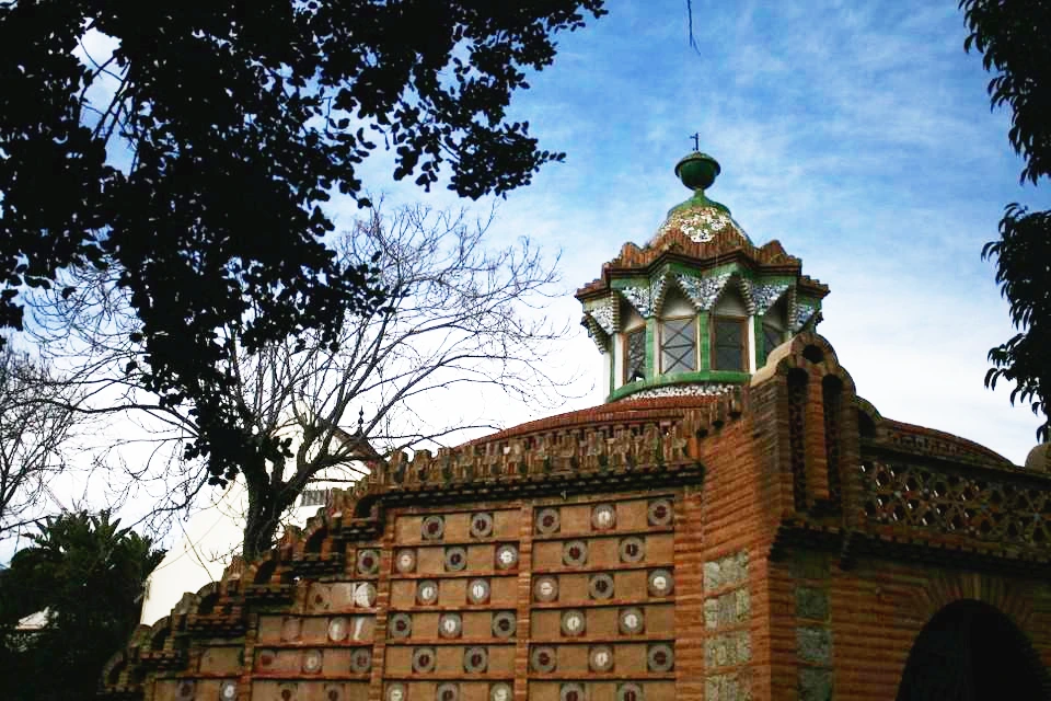 구엘 별장의 정문. 용 한 마리가 포효하고 있다. 정문의 용은 잠의 요정인 헤스페리데스라는 세명의 처녀들과 동굴 뱀 라돈에게 황금열매가 열리는 나무를 헤라클레스로부터 지키도록 했다는 신화를 재현했다고 한다. 내부는 트렌카디스라고 하는 깨진 타일 조각을 이용한 모자이크 방법을 사용한다. 소소한 느낌이 느껴지는 별장이었다.