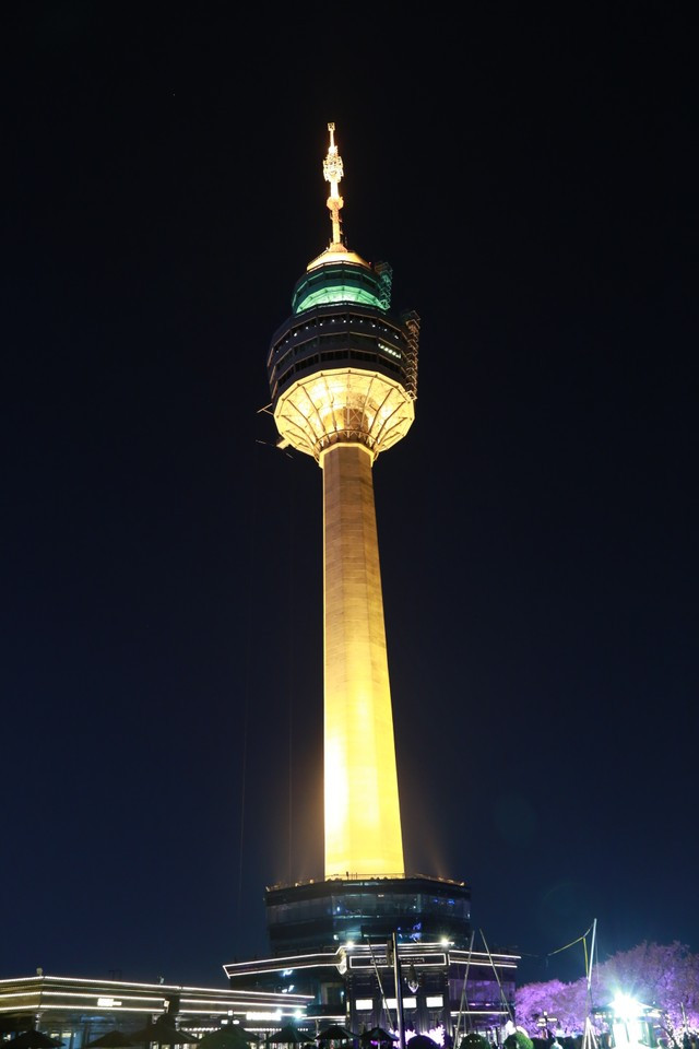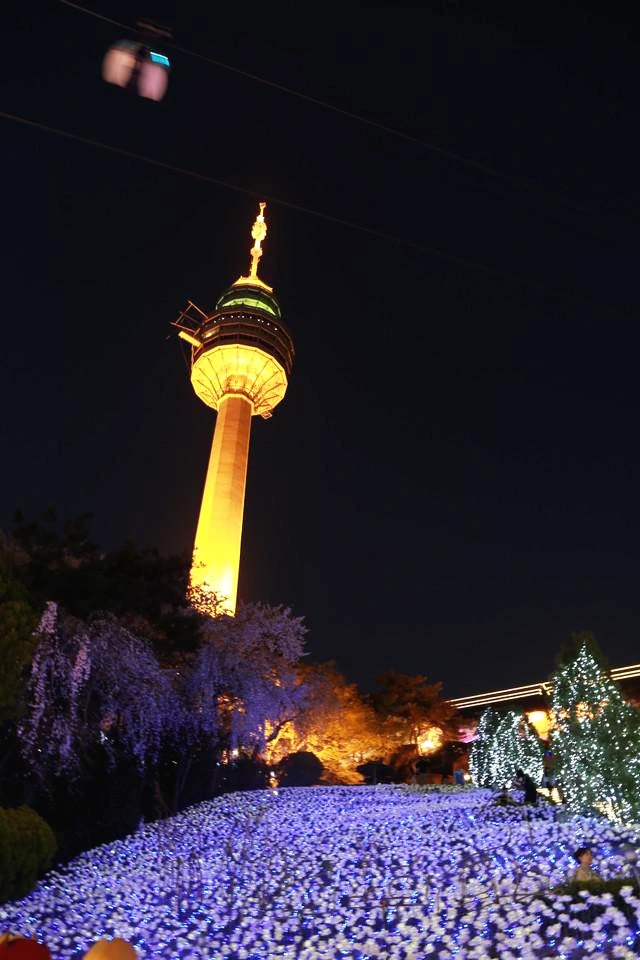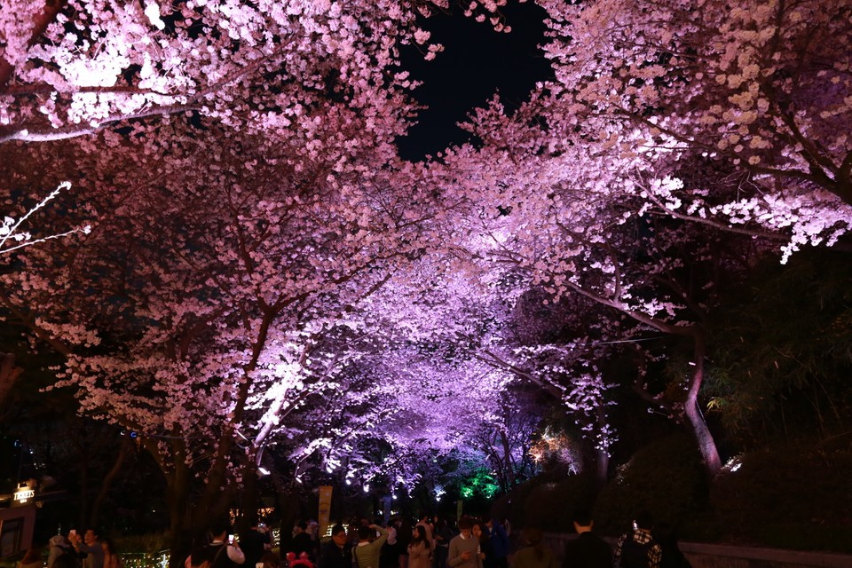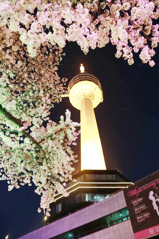 타워 주변으로 벚꽃이 가득하다. 어두운 밤하늘에 불빛과 달빛으로 빛나는 벚꽃은 낮의 아름다움과는 또 다르다.
