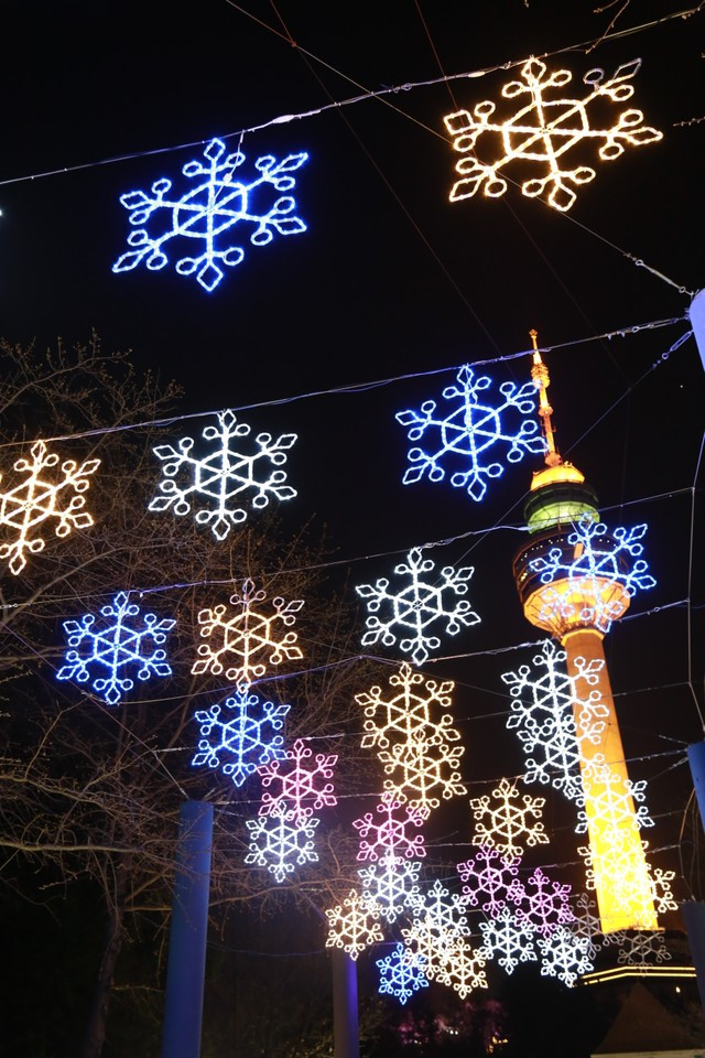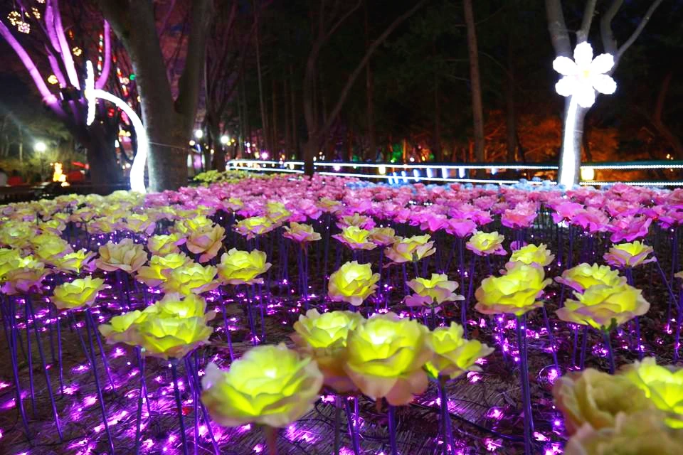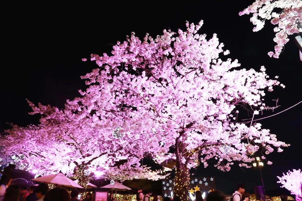 벚꽃뿐만 아니라 길 주변으로 수많은 전구가 빛을 내고 있다. 작은 전구들이 모여 어두운 밤하늘을 수놓는다.