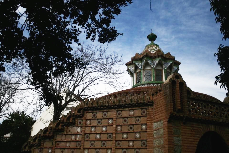 구엘 별장의 정문. 용 한 마리가 포효하고 있다. 정문의 용은 잠의 요정인 헤스페리데스라는 세명의 처녀들과 동굴 뱀 라돈에게 황금열매가 열리는 나무를 헤라클레스로부터 지키도록 했다는 신화를 재현했다고 한다. 내부는 트렌카디스라고 하는 깨진 타일 조각을 이용한 모자이크 방법을 사용한다. 소소한 느낌이 느껴지는 별장이었다.