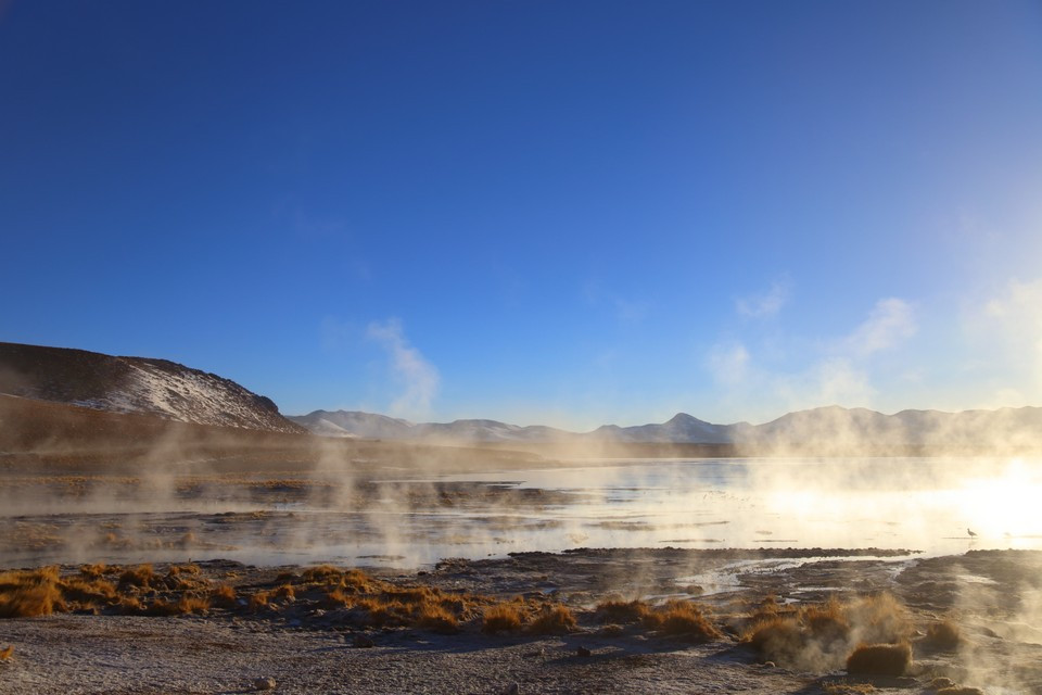 동이 터오를 무렵 도착한 온천지역. 만년설 사이로 온천수가 호수를 이루고 있다. 따뜻한 온천수와 차가운 공기가 만들어내는 뿌연 안개가 온 세상을 덮는다. 근처에 갔을 뿐인데도 얼었던 몸이 녹는다. 노천탕 주변으로 이 추위에도 풀들이 많다.