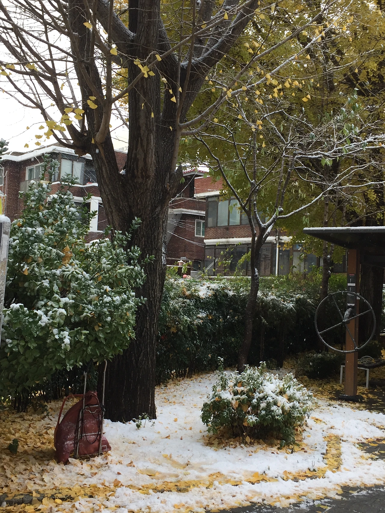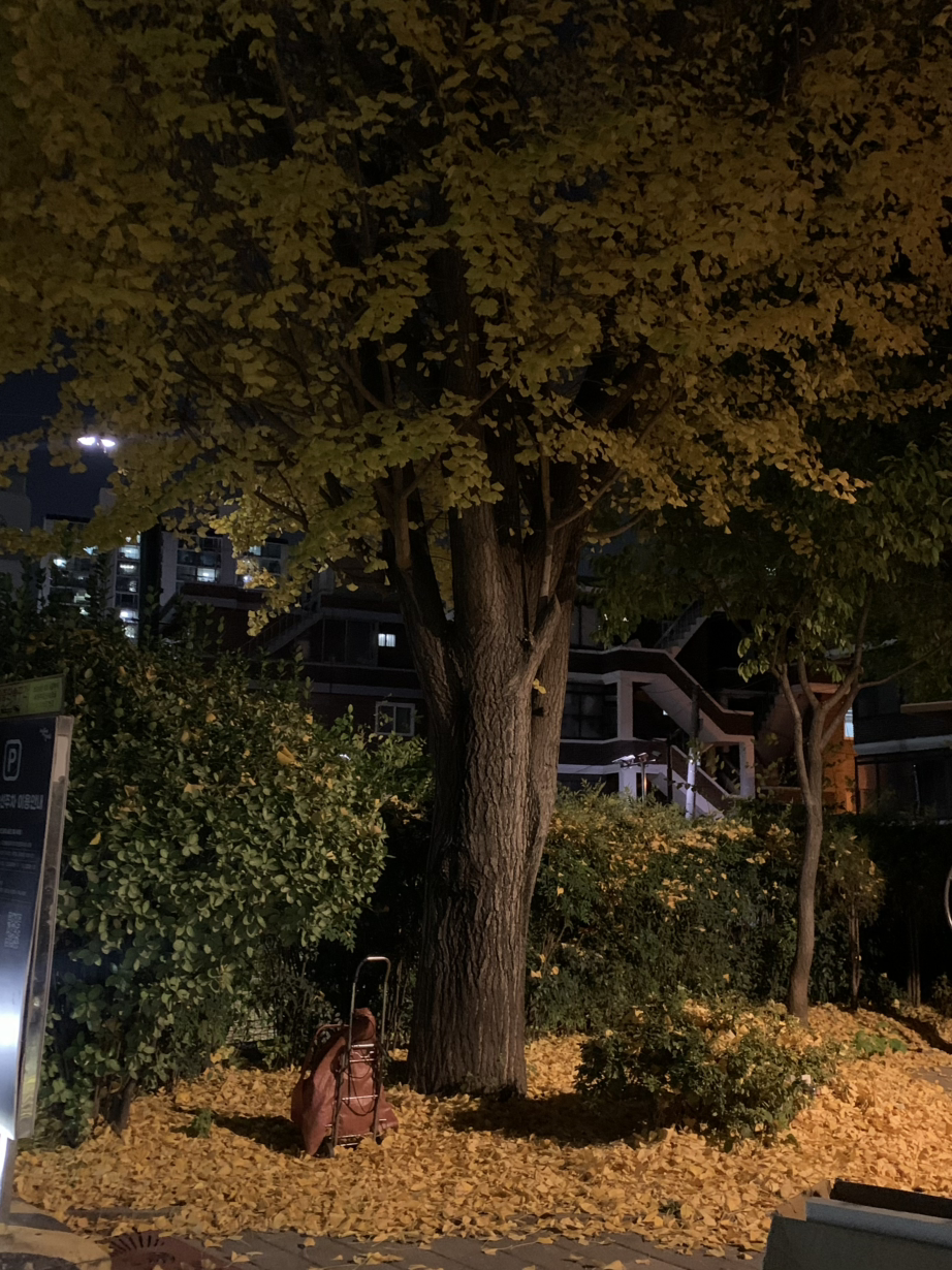 푸릇했던 나무가 노랗게 익는데 불과 일주일 반의 시간이 흐른듯했고 또 앙상해지기까지 일주일의 시간이 걸린 것 같았다. ‘잎이 다 떨어졌네’라고 생각하며 지나다니던 길이었는데 집에 가는 길에 유난히 한 구간이 밝게 부셨다. 저절로 돌아간 눈에 담긴 건 노랗게 밝힌 가로등과 그 아래 소복이 쌓여있던 많은 은행나무잎이었다. 그 많던 잎들은 어디 갔나 했는데, 바로 그 아래에 모여 있었다니.