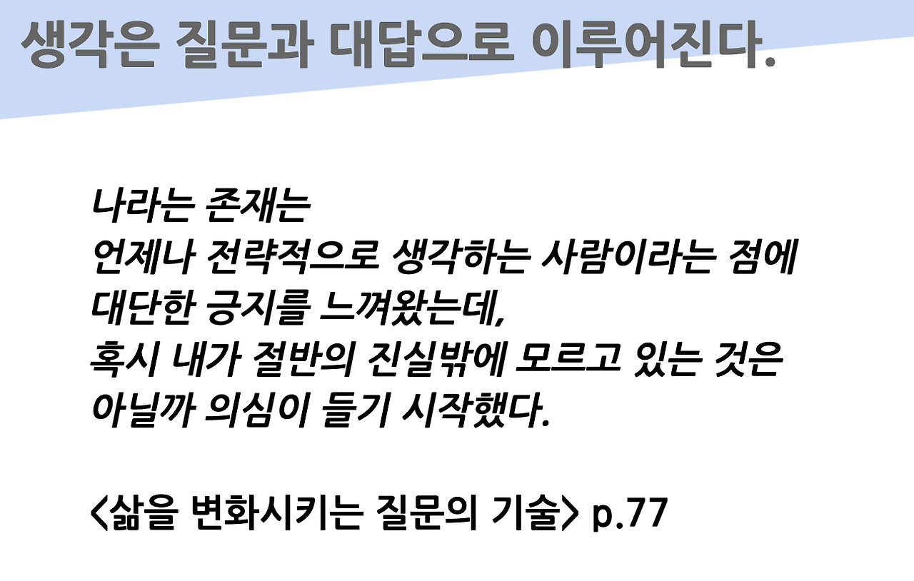 나는 문제가 생기면, 어떻게 해결할 수 있을지를 고민하며 What to do에 대한 결론을 성급하게 얻고 이를 빨리 실행해서 그 상황을 벗어나고 싶어 했다. 하지만 <삶을 변화시키는 질문의 기술> 책을 읽으며 깨달았다. 행동의 변화는, 정답같은 솔루션 즉 to do 제시가 아닌 '질문'으로 시작되는 사고의 전환/확장이라는 걸.