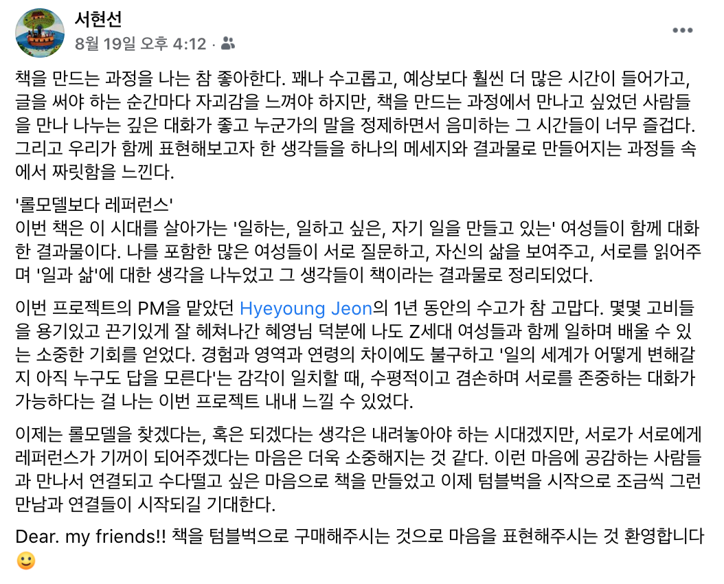 진저티프로젝트 서현선 대표 SNS, <롤모델보다 레퍼런스> 펀딩 소식