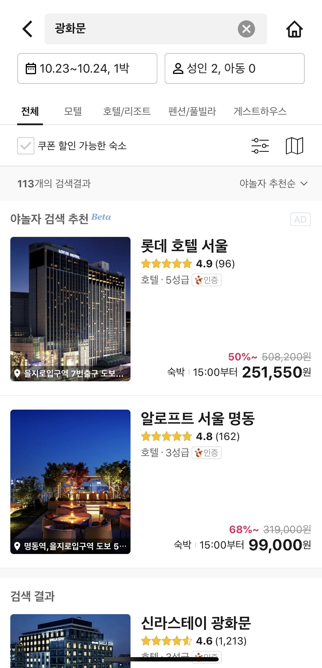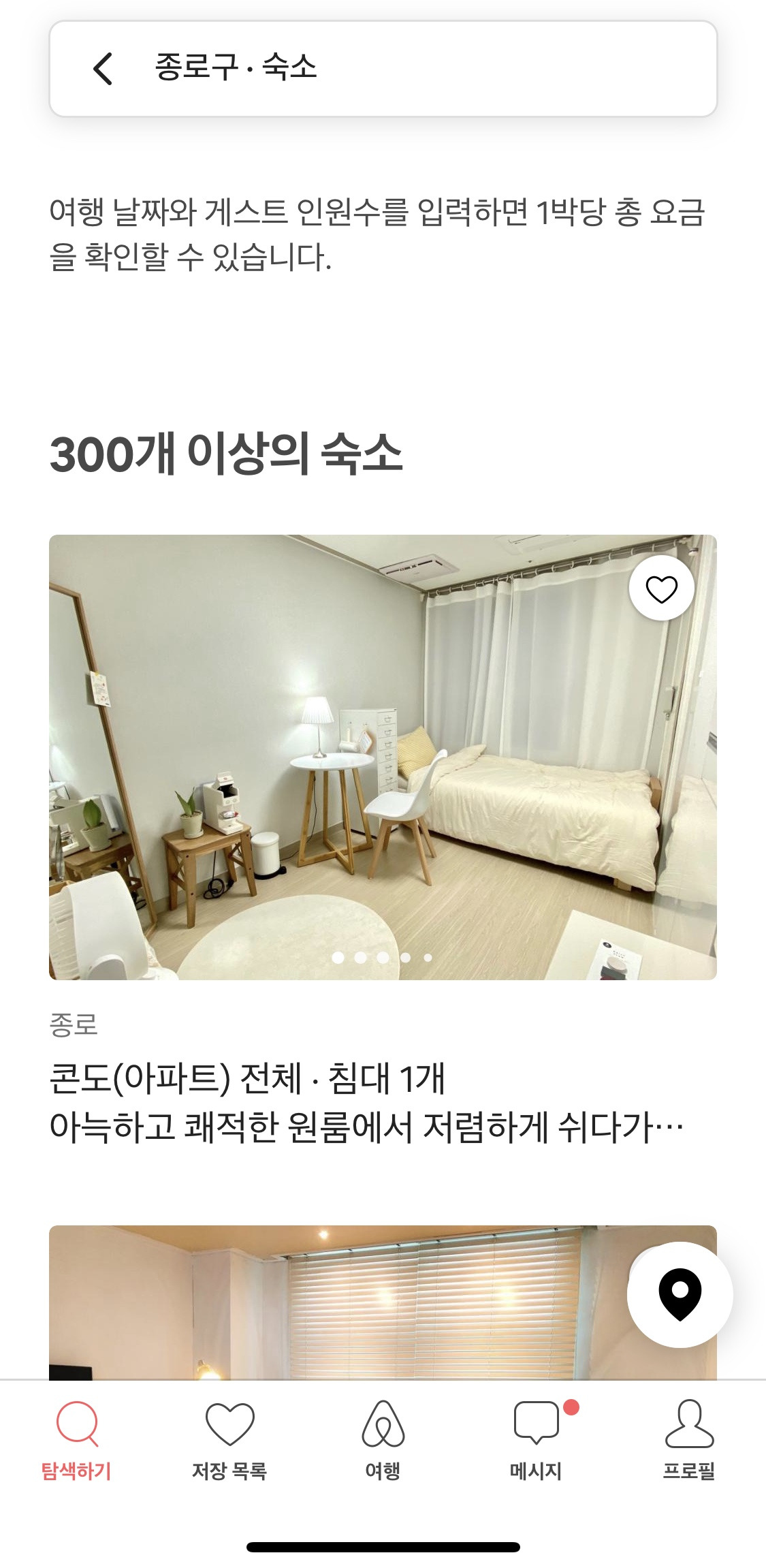 이렇게 300개 이상의 숙소가 검색됩니다. 이중 몇 개는 광화문 근처에 위치하겠죠? 저는 숙소를 검색하기 위해 제 목적지가 어느 동에 있는지 확인해야 했고 해당 동 뿐만 아니라 주변의 다른 동의 이름까지 알아보고 여러 번 검색해서 숙소를 겨우 찾을 수 있었습니다. 이게 왜 그렇게 불편했냐면,