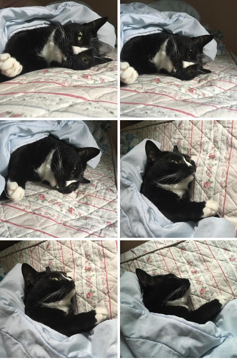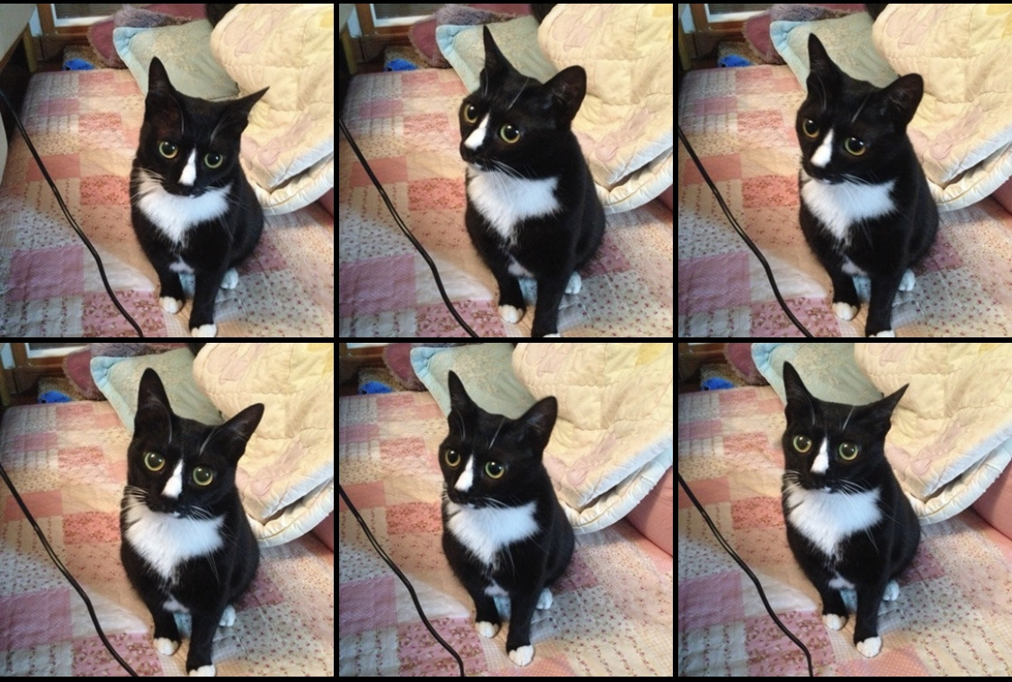 감이 오시나요? 바로 '비슷한 사진 못 지우는 병'입니다. 고양이가 너무 귀여울 때 휴대폰을 얼른 들고 카메라 어플을 켭니다. 연속으로 셔터를 눌러댑니다. 고양이는 움직임이 빠르기 때문에 여러 장 찍으면 움직임이 다 달라요. 동공이 확장된 정도, 고개의 각도, 수염의 위치 변화... 위 사진도 남이 보기엔 다 똑같은 사진 6장이겠지만 제 눈에는 다 달라 보인답니다(팔불출).