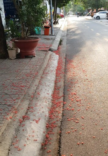 베트남의 남부는 사계절이 뚜렷하지 않다고 말한다. 하지만 그 나무 아래에 서 있으니 다른 생각이 들었다. 나무 위의 꽃들은 지금이 봄이라고 말하는 것 같고, 푸르게 무성한 잎들은 여름을 자랑한다. 한켠에는 말라버린 가지와 잎들이 쓰러져 여긴 가을이라고 조용히 말하고 있다. 꽃들은 이미 떨어져 바닥을 채우고 있다. 떨어진 모습은 가을인데 색은 아직 봄이다.